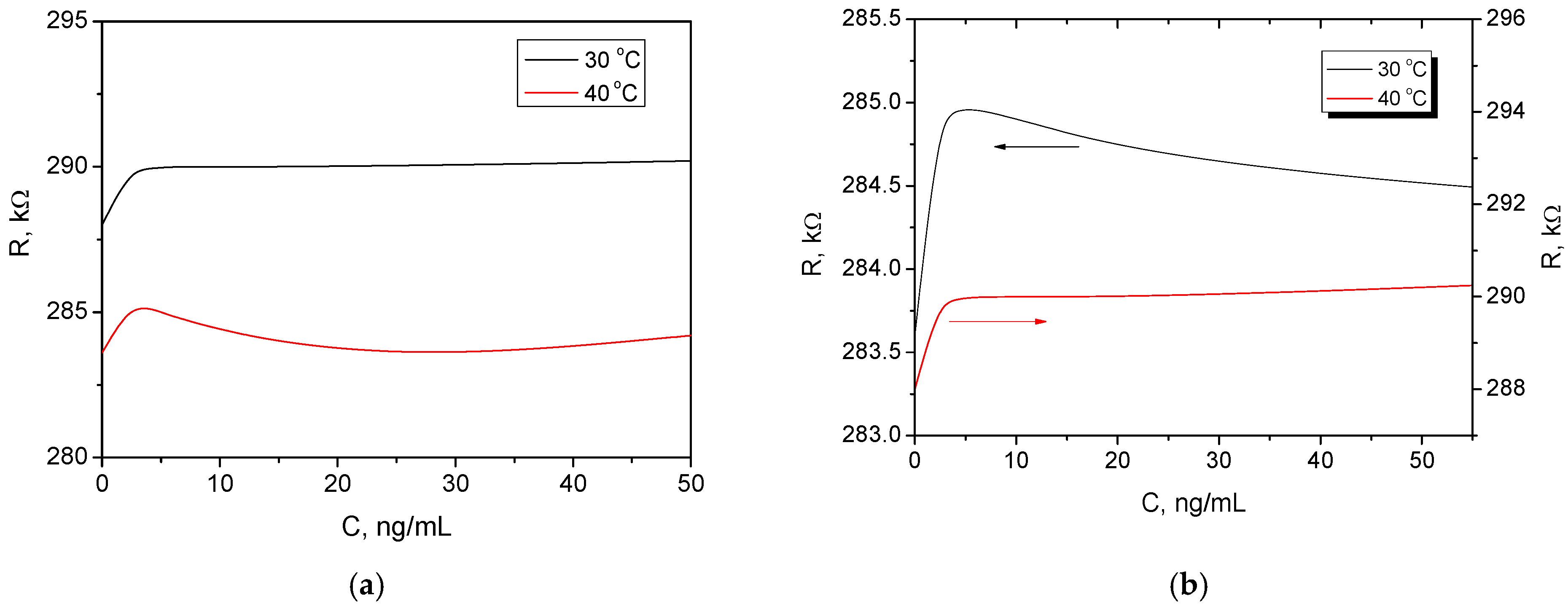 Figure 6a), the baseline resistance (at 0 ng/mL cortisol) is lower at 40 °C compared to 30 °C (e.g., ~283 kΩ at 40 °C vs. ~288 kΩ at 30 °C). The overall change in resistance (the sensor’s response magnitude to cortisol) appears slightly reduced at 40 °C compared to 30 °C, although the general trend is maintained. The overall resistance values in