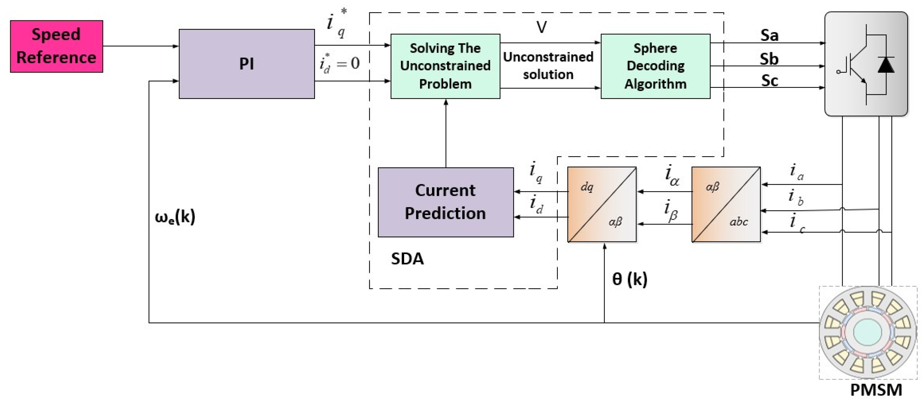 A two-level inverter with a PMSM drive is the system under consideration. The SDA-MPC framework is shown in Figure 2. The system variables are described in Table 1. The prediction model for the system is summarized in the same table.