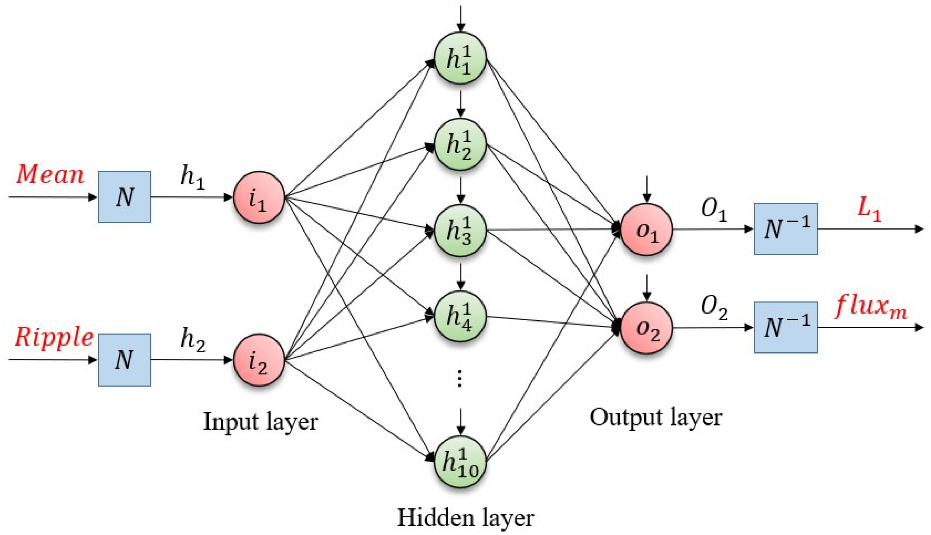 A Feedforward Artificial Neural Network (ANN), also referred to as a fully connected neural network, is among the earliest architectures developed in artificial intelligence [37]. Unlike conventional function-fitting methods such as polynomial or exponential regression, an Feedforward ANN does not require an explicitly defined functional form. Instead, the mapping between inputs and outputs is autonomously learned from data, enabling its application across a wide range of electrical engineering problems, including reliability-oriented design of power electronic converters [38,39] and power loss correction in permanent-magnet synchronous machines [40].