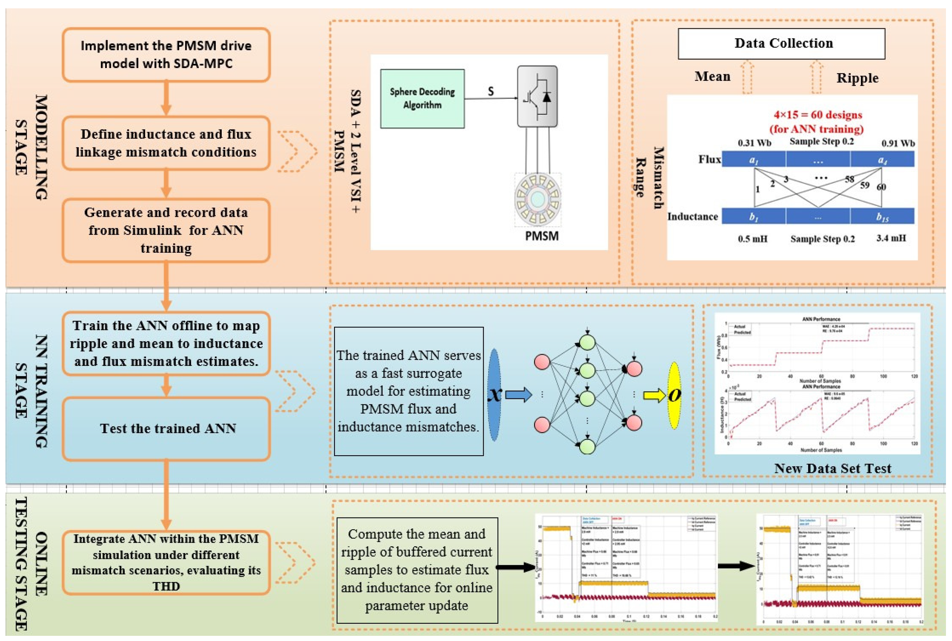 Figure 4. Overview of the proposed three-stage workflow for ANN-based parameter mismatch compensation in PMSM drives: (1) Modelling and Data Generation—PMSM with SDA-MPC simulated under ± 50 % flux and inductance variations; (2) Training Stage—offline ANN training and validation using simulated current and voltage data; (3) Online Testing—deployment of the trained ANN for real-time parameter update and performance evaluation under mismatch conditions.