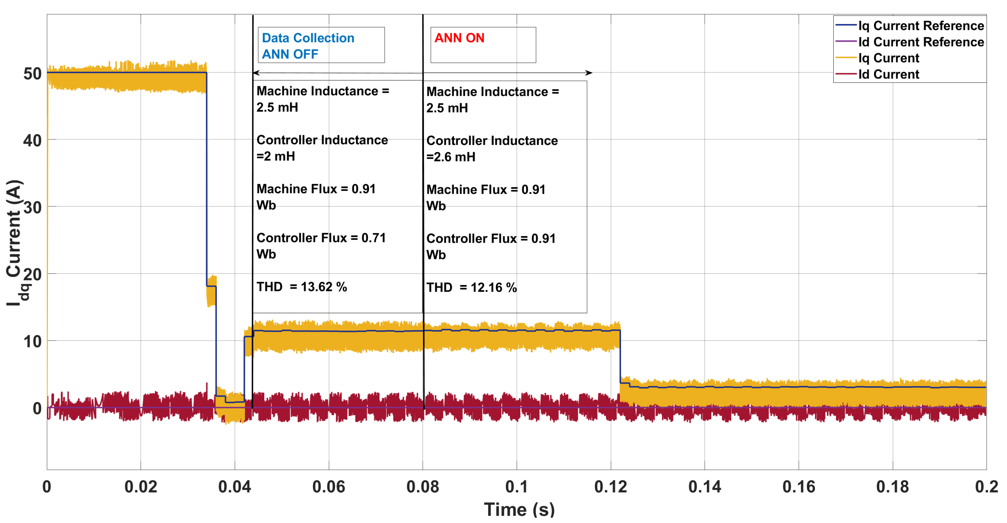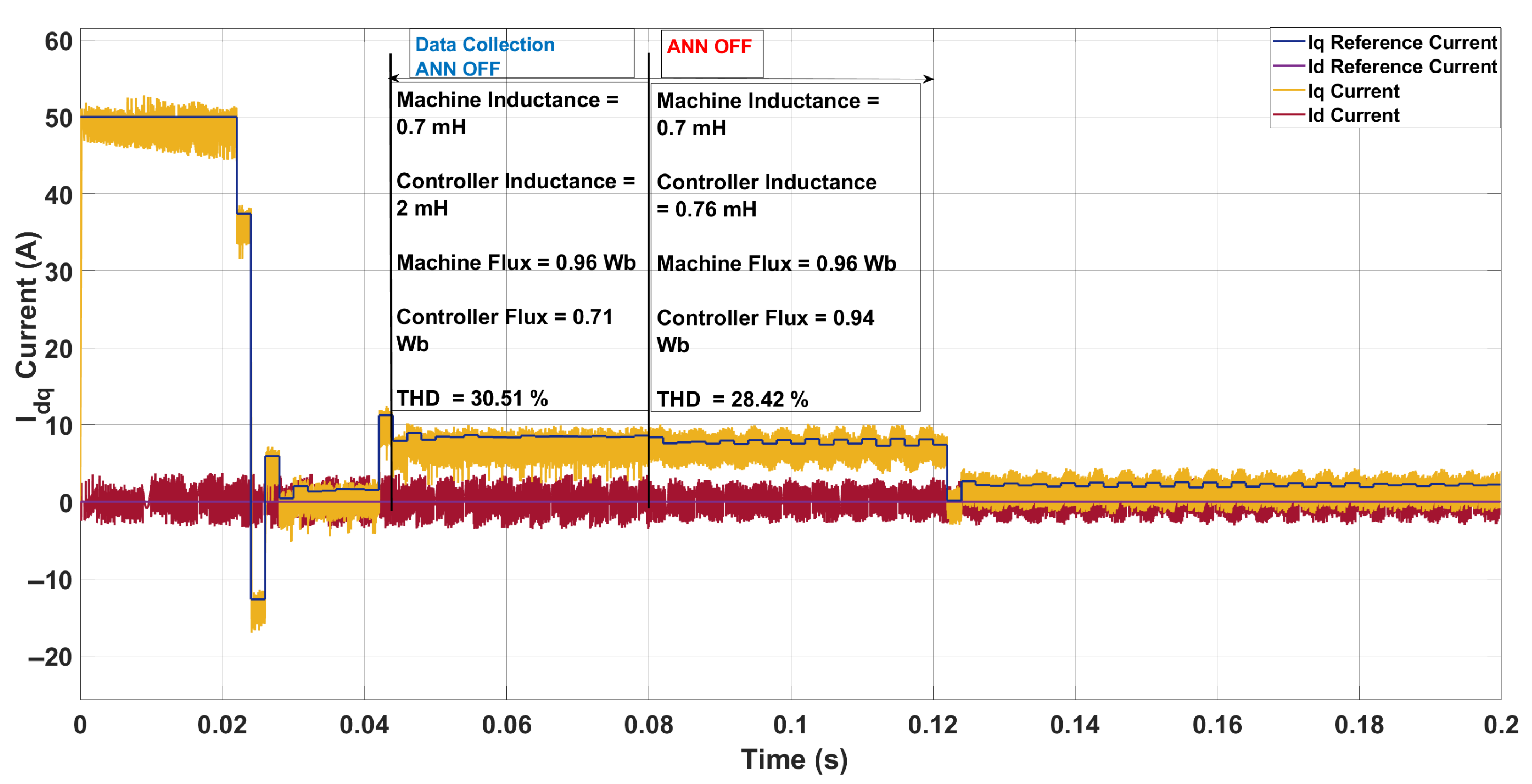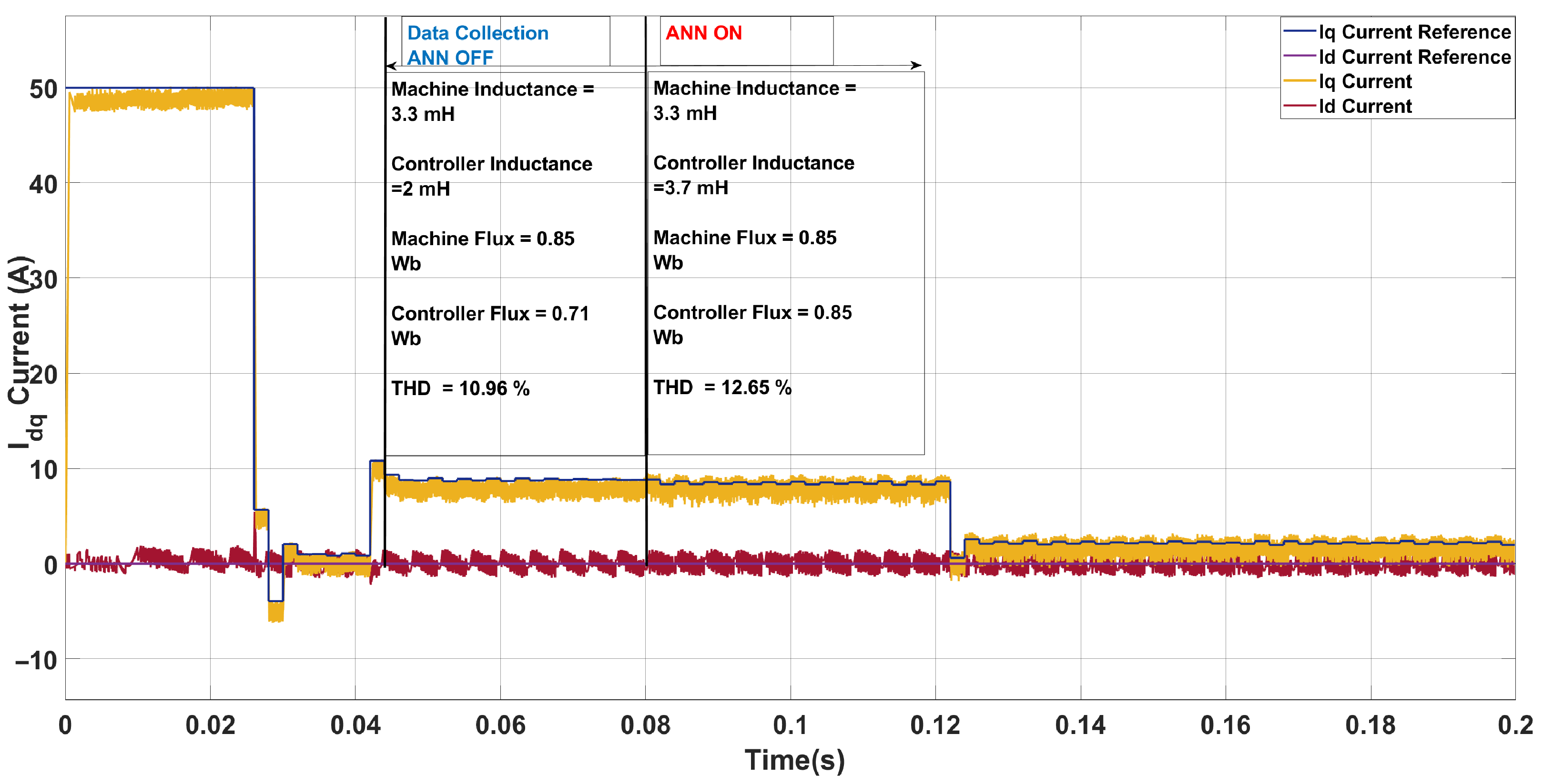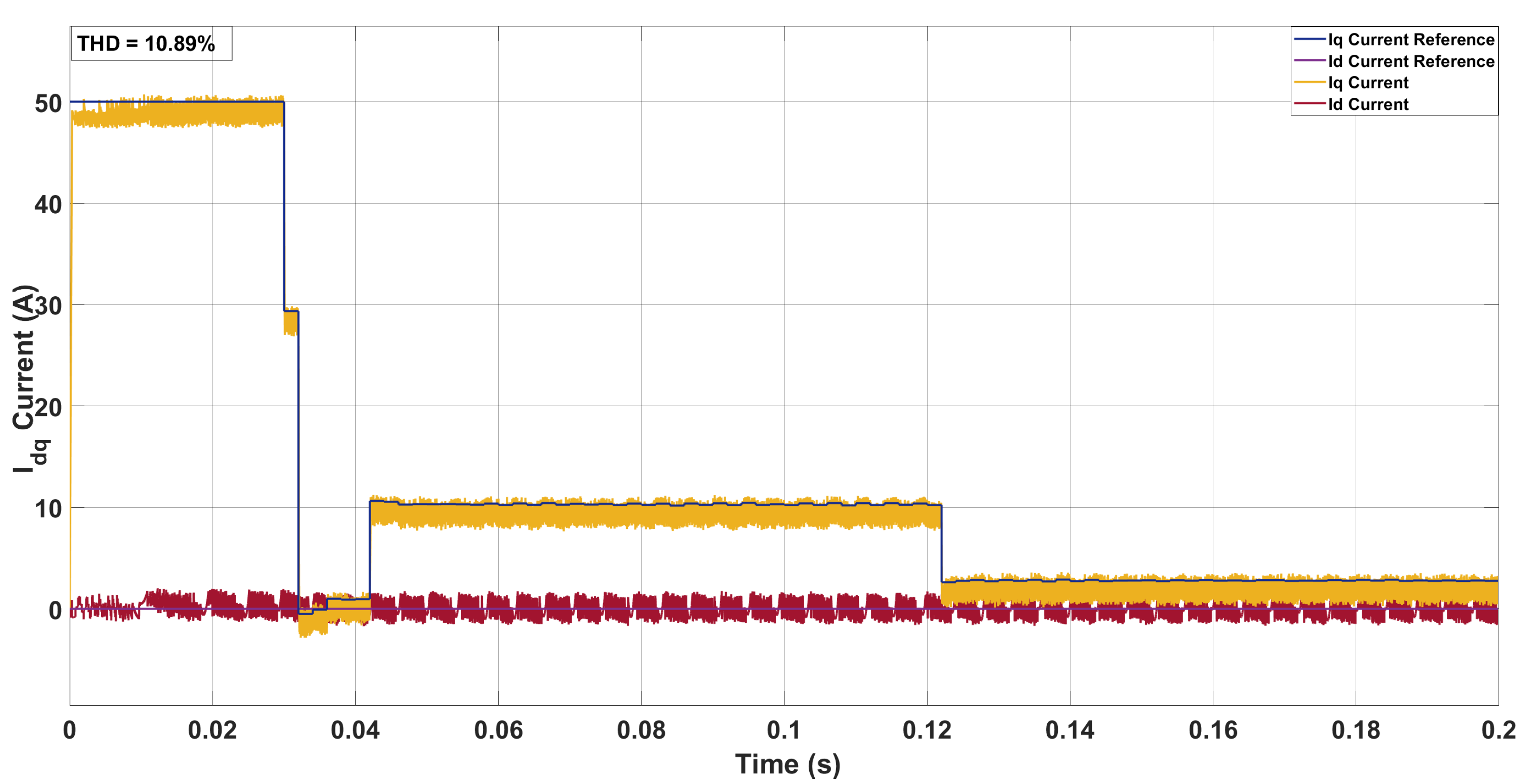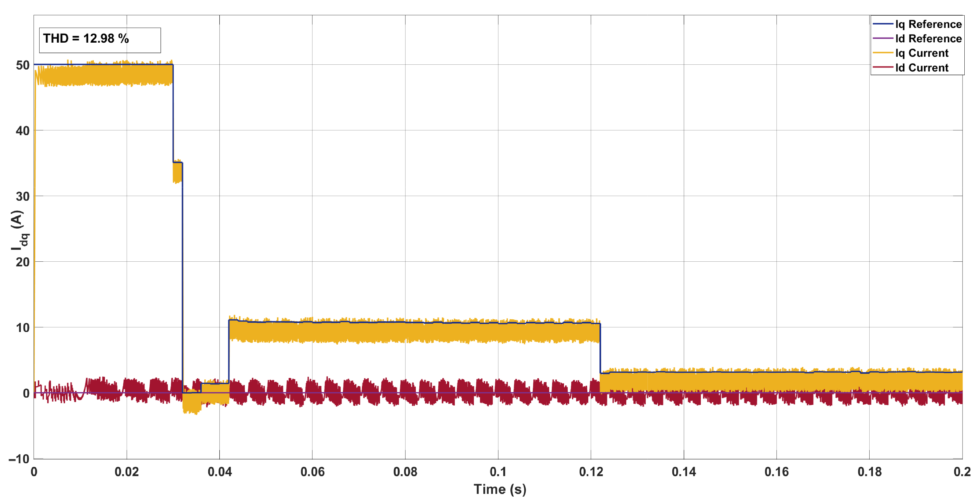 In this work, THD is computed on the phase current signals of the PMSM, as these directly reflect the quality of the motor drive currents and are most relevant for torque ripple and machine losses. For completeness, the q-axis current is also monitored in the discussion, but all reported THD values correspond to the three-phase stator currents.