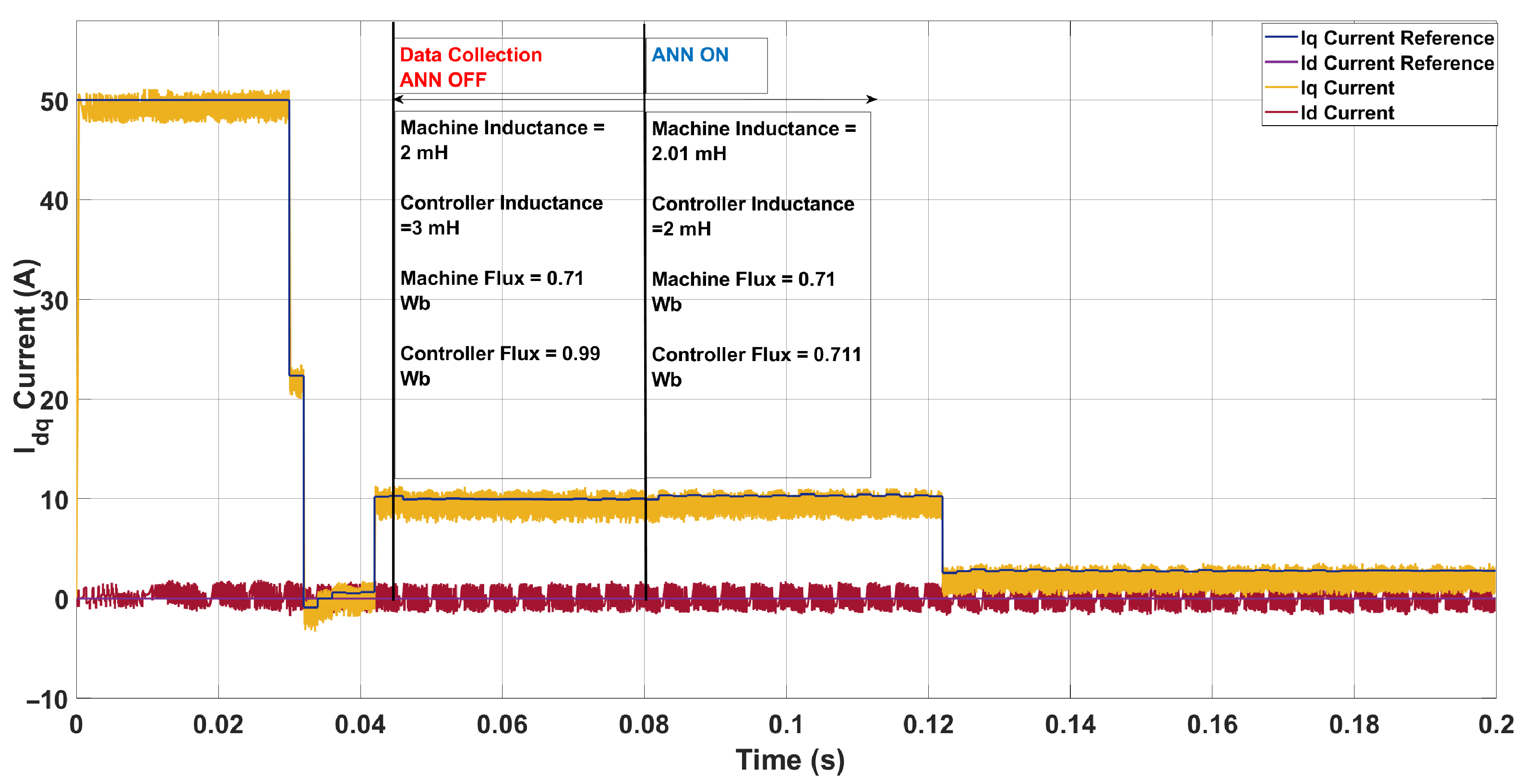 In [23], parameter mismatch misidentification led to very high total harmonic distortion (THD) in some cases, while in others the switching frequency increased to compensate for an inductance mismatch. With respect to flux mismatch, the impact was primarily observed on the reference currents when the mismatch was introduced at the controller level. Specifically, for certain flux values, the i d reference appeared shifted upward compared to the actual i d current, giving the impression of an undershoot, whereas for other values it was shifted downward, again resembling an undershoot. This effect occurred because the controller flux or inductance values were altered while keeping the machine parameters constant. In contrast, the present study investigates the opposite scenario, where the controller parameters (flux and inductance) are kept constant while the corresponding machine parameters are varied. The flux and inductance were chosen as key parameters to be varied because they have more influence on the steady state of the PMSM [24,25]. This distinction is crucial, as mismatch originating in the machine itself requires a different identification and compensation strategy compared to mismatch introduced at the controller level.