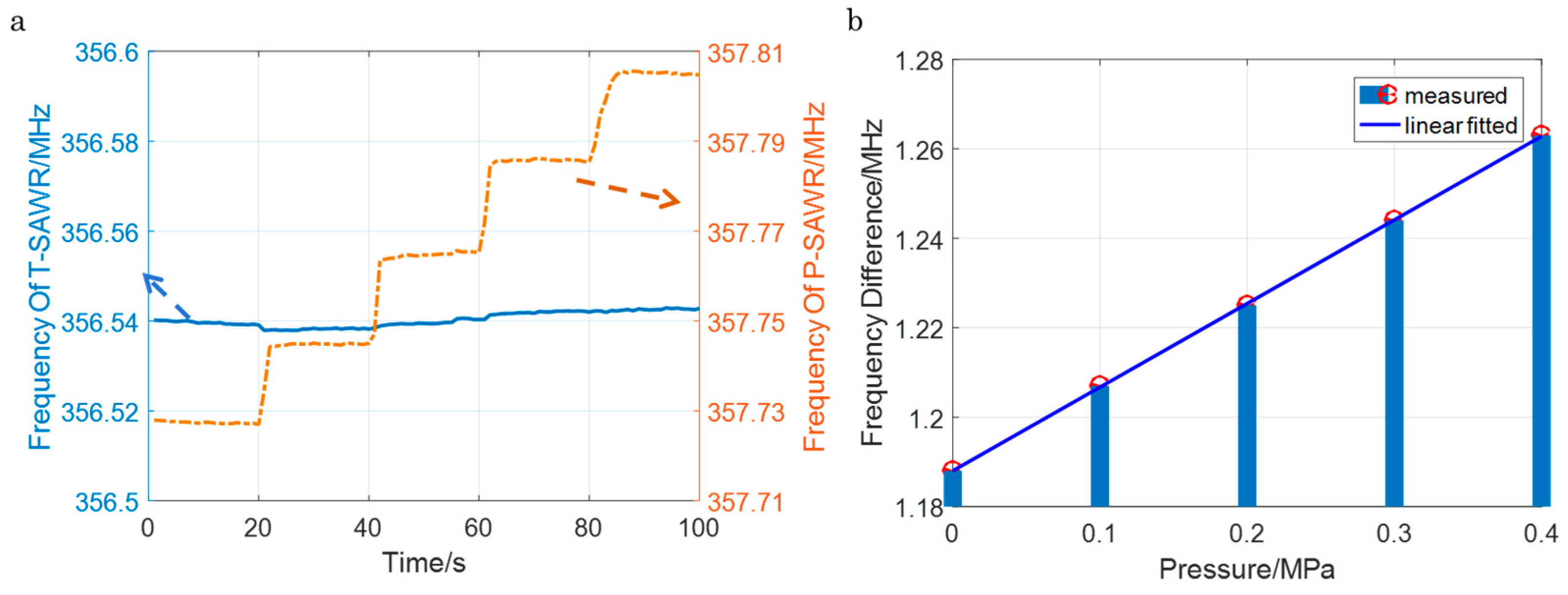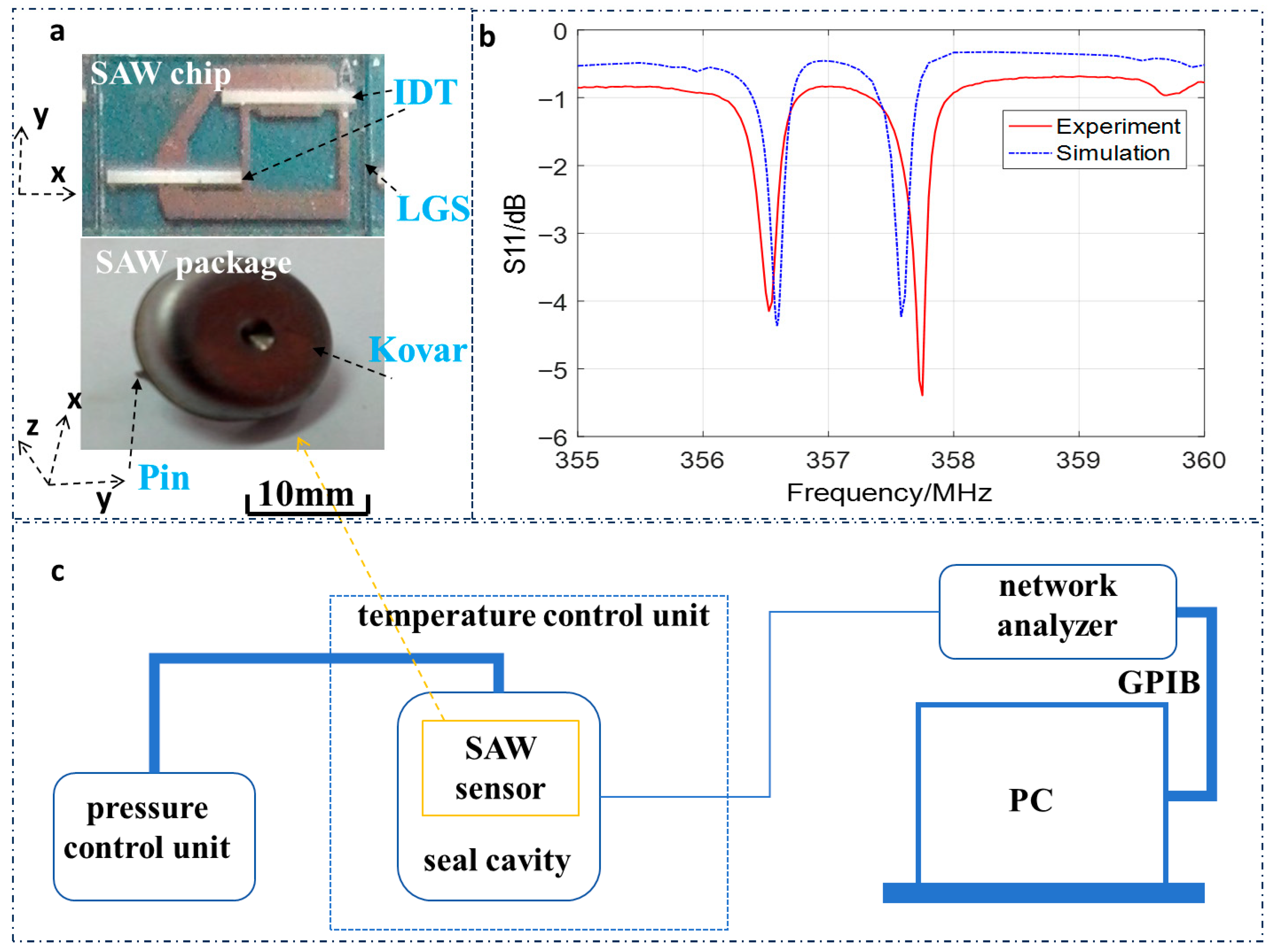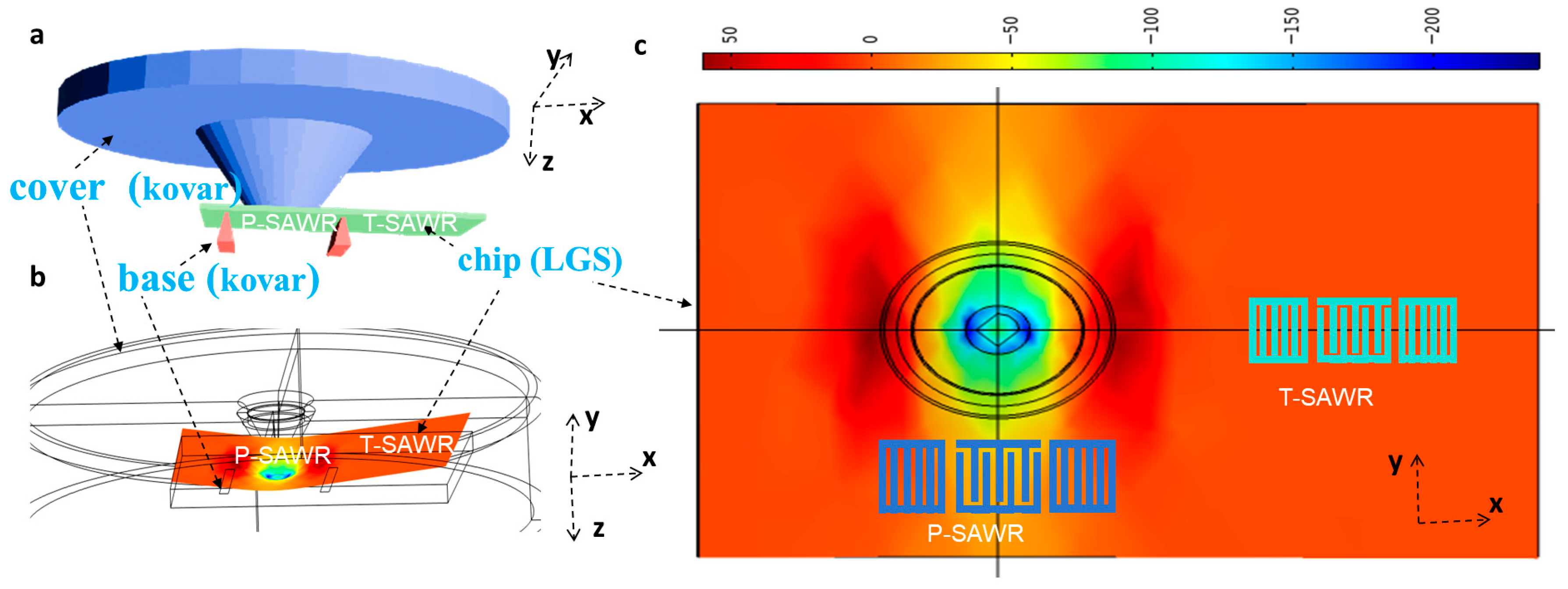 - Li, H.L.; Ke, Y.B.; Zhao, Y.Y.; Cheng, L.N.; He, S.T. Investigation of langasite surface acoustic wave pressure sensors with a structure of reinforcing its pressure sensitivity. In Proceedings of the 2015 IEEE International Ultrasonics Symposium (IUS), Taipei, Taiwan, 21–24 October 2015. [Google Scholar]