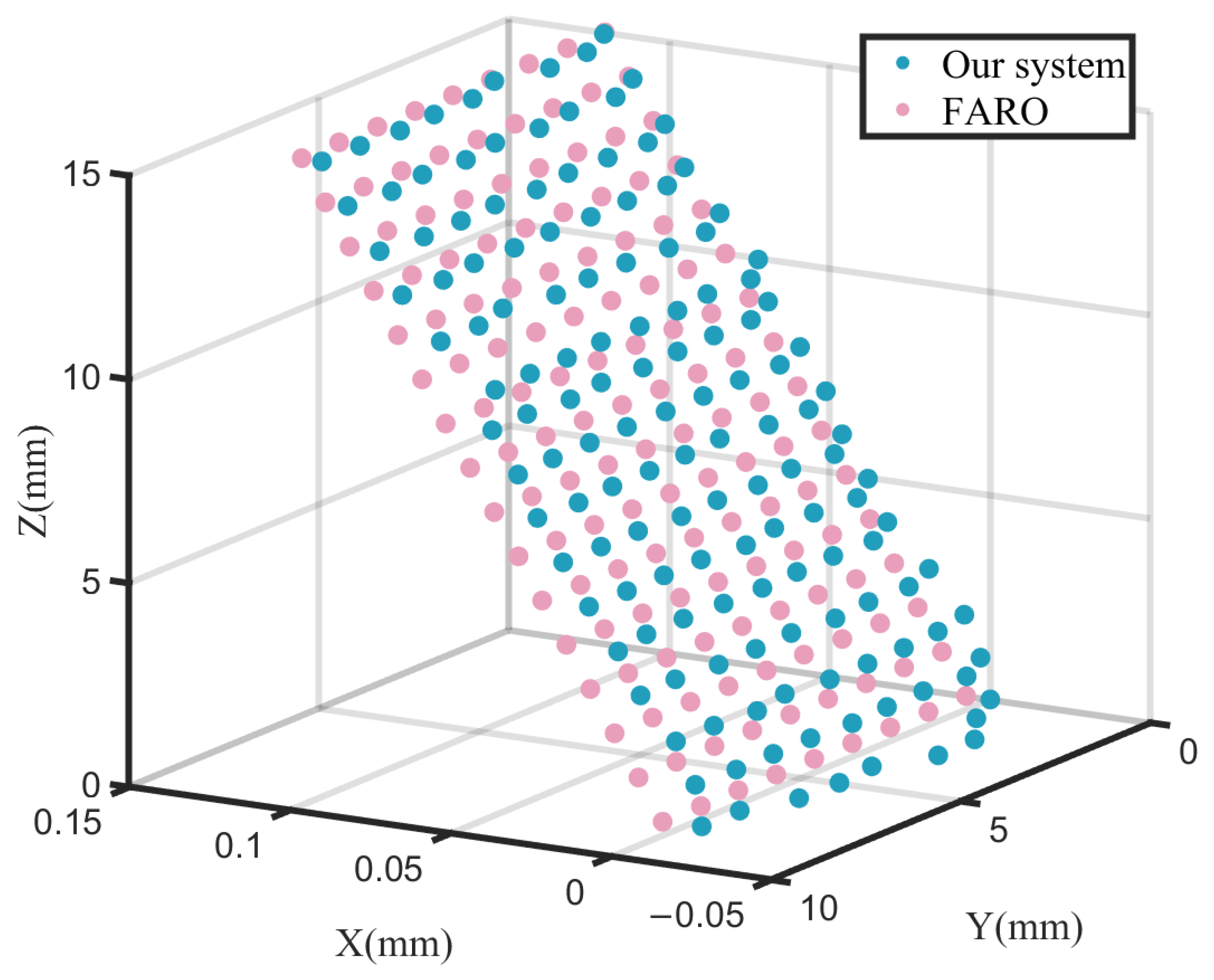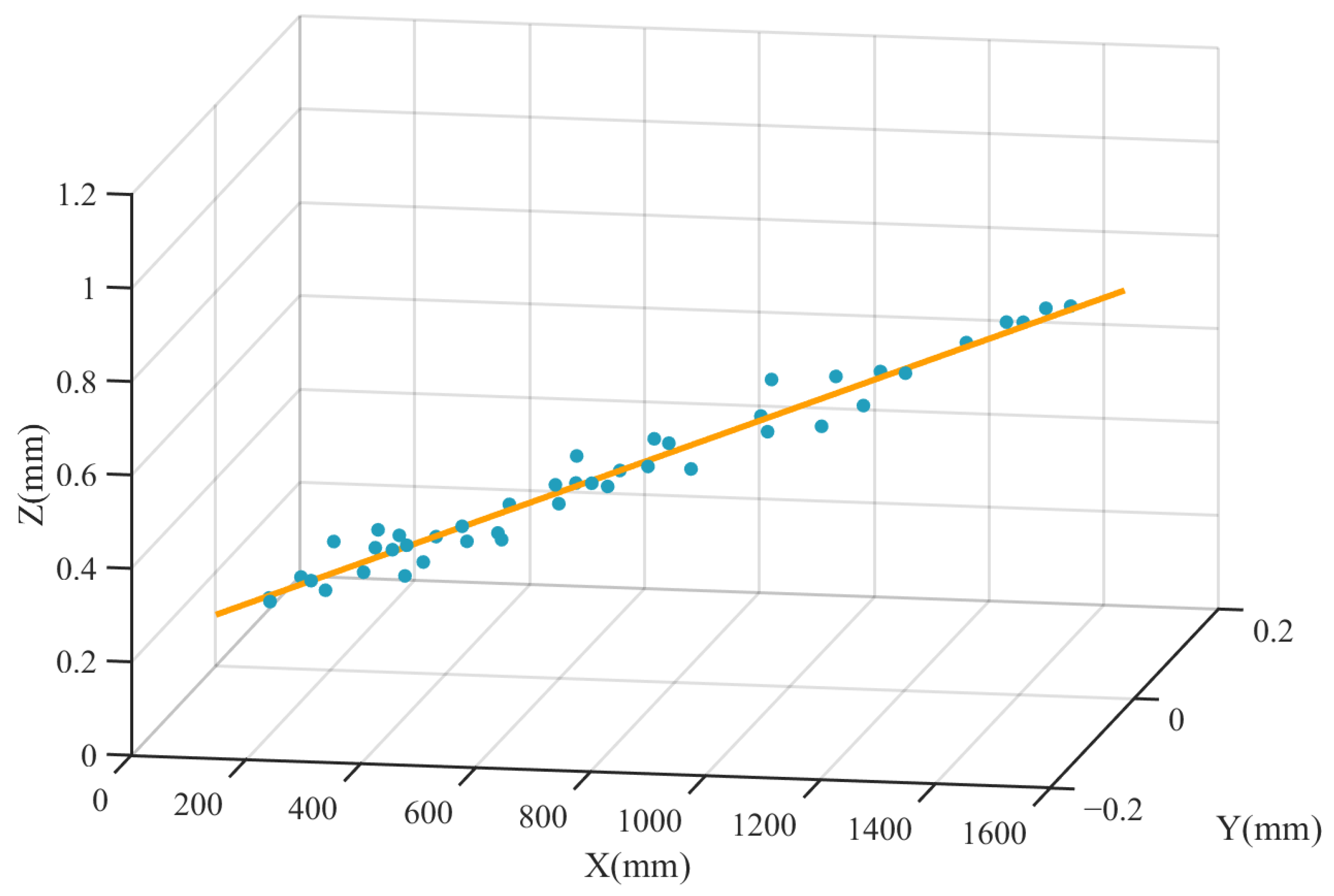 - Quantitative improvement potential of angular error. The current angular error (caused by encoder resolution, turntable axis orthogonality deviation, and mechanical installation errors) results in a spatial deviation of approximately 0.052 mm at a measurement distance of 1 m, accounting for 27.5% of the total error (0.052/0.189). By adopting a higher-resolution encoder (improving the repeatability from the existing 0.003° to 0.001°) and correcting the axis deviation through an orthogonality error compensation algorithm, the spatial deviation caused by angular error can be reduced to 0.017 mm. This single reduction contributes approximately 0.035 mm, corresponding to an 18.5% decrease in the total measurement error.
