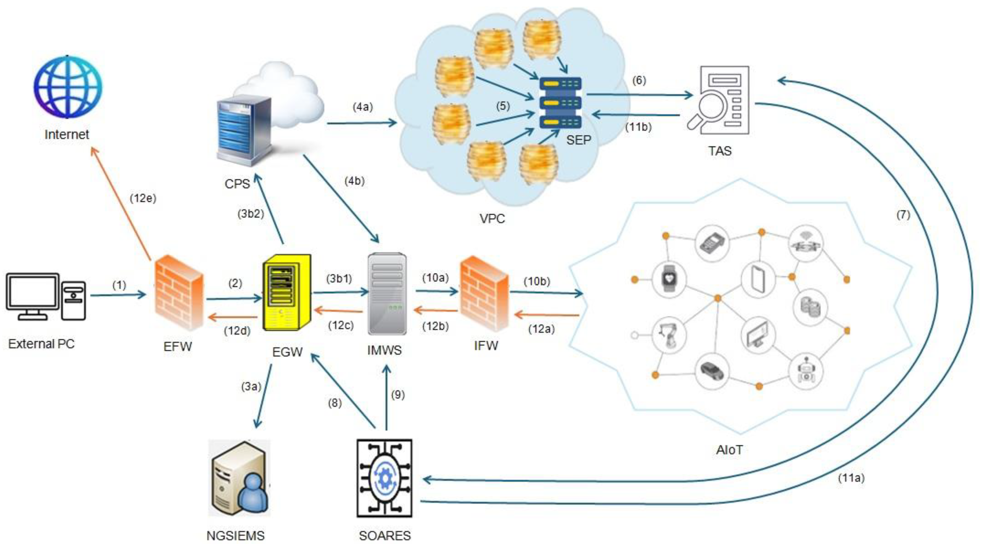 Finally, in the case of an AIoT-based device attempts to access the internet, its outbound request does not go directly out but passes through a controlled security chain. Firstly, the IFW (case 12a) verifies if the connection request is permitted based on its protocol, destination, and predefined security policies. After this initial check, the request passes through the IMWS (case 12b) and EGW (case 12c), in which advanced inspection techniques, metadata analysis, and redirection security policies can be applied to identify potential suspicious activity. If the request is considered to be safe, the traffic is forwarded to the EFW (case 12d) that performs the final filtering and NAT operation, before allowing this to access the Internet (case 12e). During this process, MELT data are captured and may be forwarded to the CPS (case 3b2) for deeper behavior analysis.