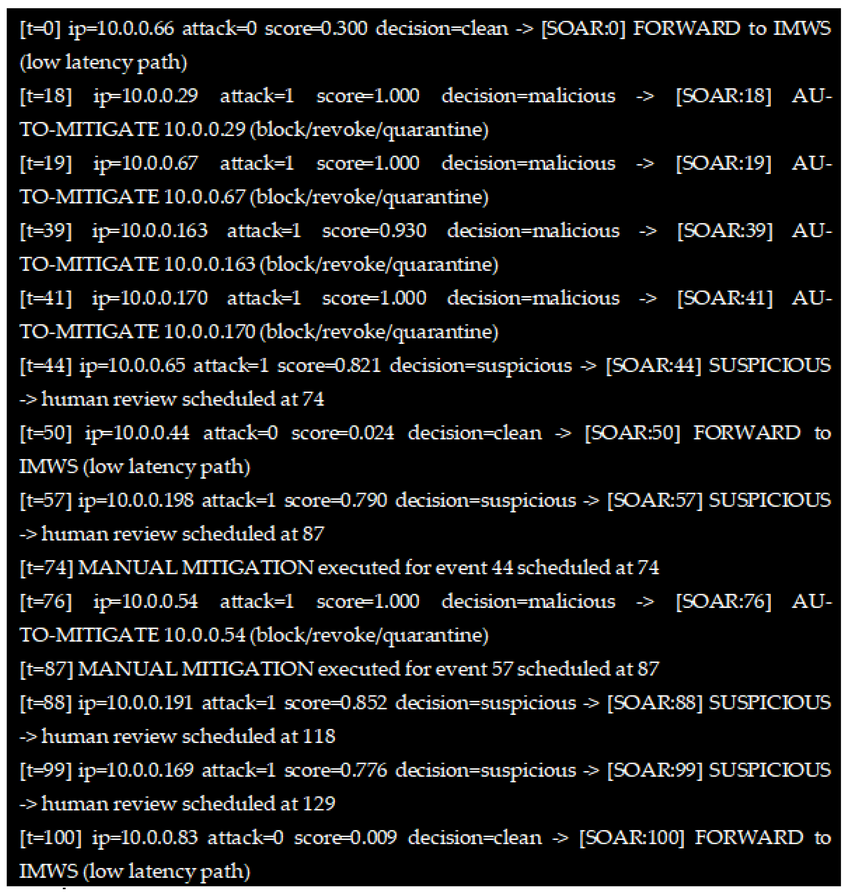 Figure 2 illustrates a sequence of sample connection events processed by the EGW and TAS. Each event is annotated with a timestamp [t], source IP, attack label, computed maliciousness score, and the corresponding decision. For clean traffic (low score), the SOAR engine forwards the request to the IMWS along the low-latency path. For malicious traffic (high score), the SOAR engine enables automated mitigation actions, including IP blocking, certificate revocation, and device quarantine.