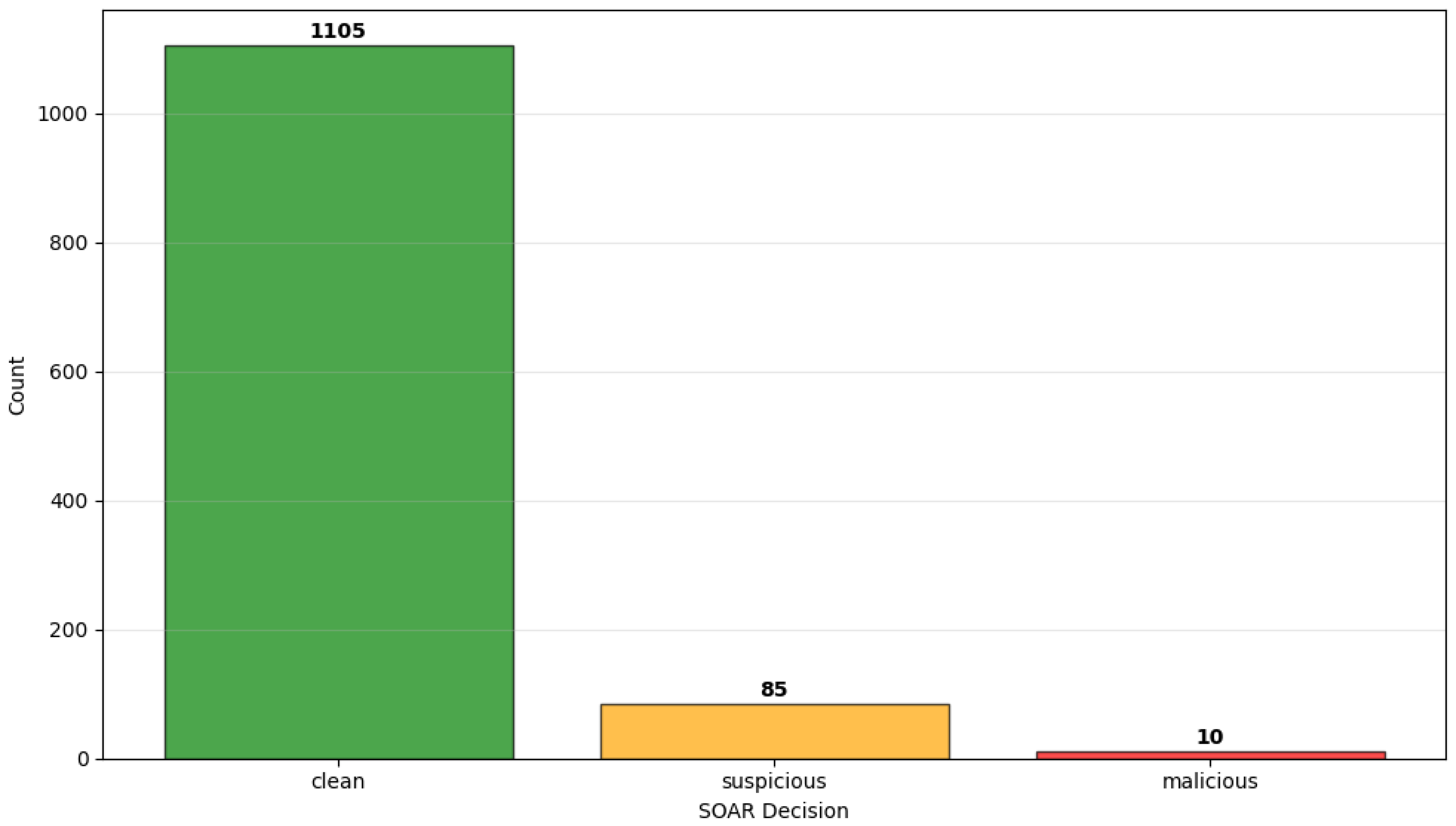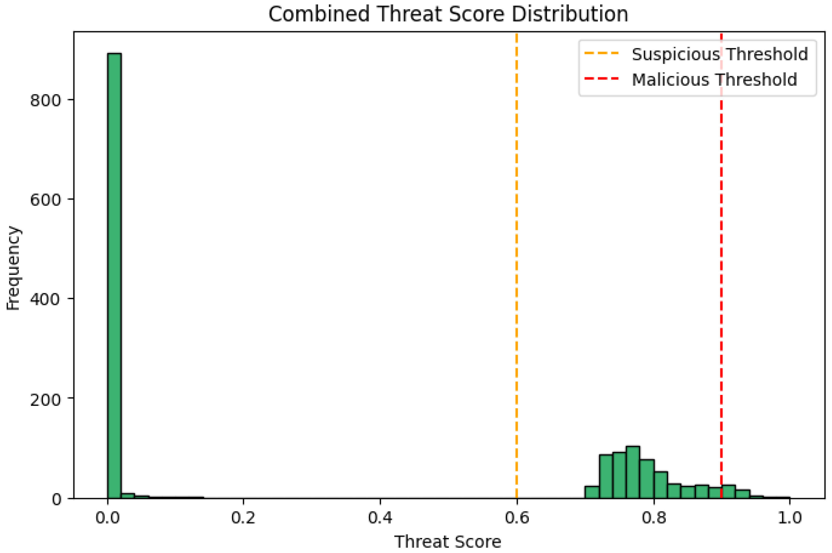 The decision making follows specific thresholds: scores > 0.9 may be treated as “malicious” and enable immediate mitigation; scores between 0.6 and 0.9 [0.6, 0.9) may be “suspicious” and result in quarantine and human review; scores below 0.6 [0, 0.6) are treated as “clean” and considered for forwarding. Low confidence predictions (confidence < 0.7) are routed for analyst verification by design. The ML pipeline also includes adversarial defenses, such as adversarial training, poisoning detection mechanisms, and input validation to reduce potential risk of model manipulation.