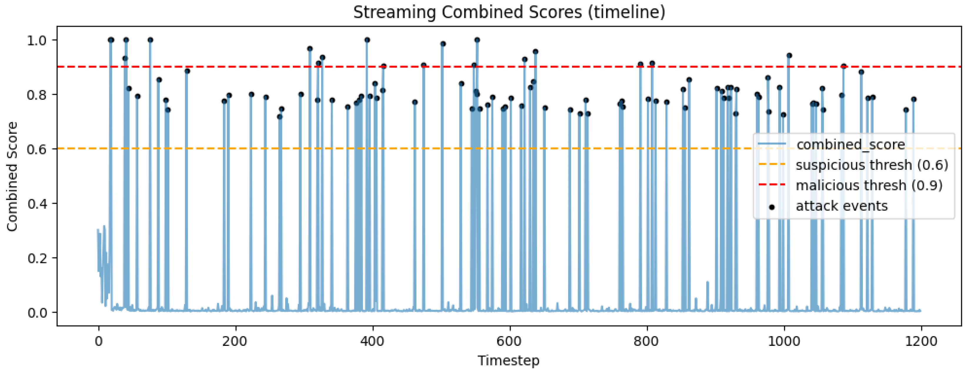 Decisions were made according to fixed score thresholds. These thresholds were empirically selected for this experimental setup and were not optimized for adversarial adaptation or long-term changes in underlying data patterns. Scores ≥ 0.9 were labeled “malicious” and triggered immediate, automated mitigation via the SOAR engine (for example: push a block rule to the gateway, revoke active sessions, and quarantine the implicated device). Scores in the [0.6, 0.9) range were labeled “suspicious”; these flows were quarantined at the middleware and escalated for human analyst review. Scores < 0.6 were treated as clean and forwarded to the internal middleware server for final attestations and delivery to the target IoT device. All actions were logged and correlated for auditability.
