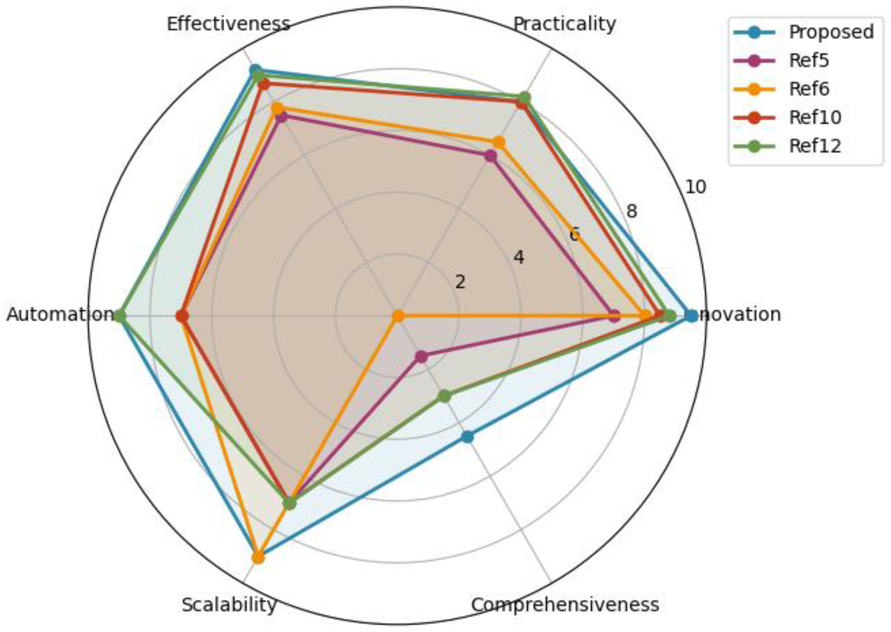 Figure 6 indicates a qualitative comparative assessment of our proposed system compared to the above state-of-the-art schemes in terms of practicality, innovation, comprehensiveness, scalability, automation, and effectiveness. Scores were assigned on a 0–10 ordinal scale based on the presence, maturity, and integration level of each capability as explicitly reported in the corresponding publications, following a consistent rubric across all compared systems. It should be noted that the assessment does not reflect absolute performance metrics, but relative architectural coverage. As illustrated in this figure, our proposed architecture exhibits broader coverage across key AIoT security dimensions, particularly in automation, comprehensiveness, and scalability. Unlike prior works that emphasize detection accuracy in isolation, our approach integrates early detection, deception-based intelligence, forensic analysis, and automated mitigation within a single operational pipeline.