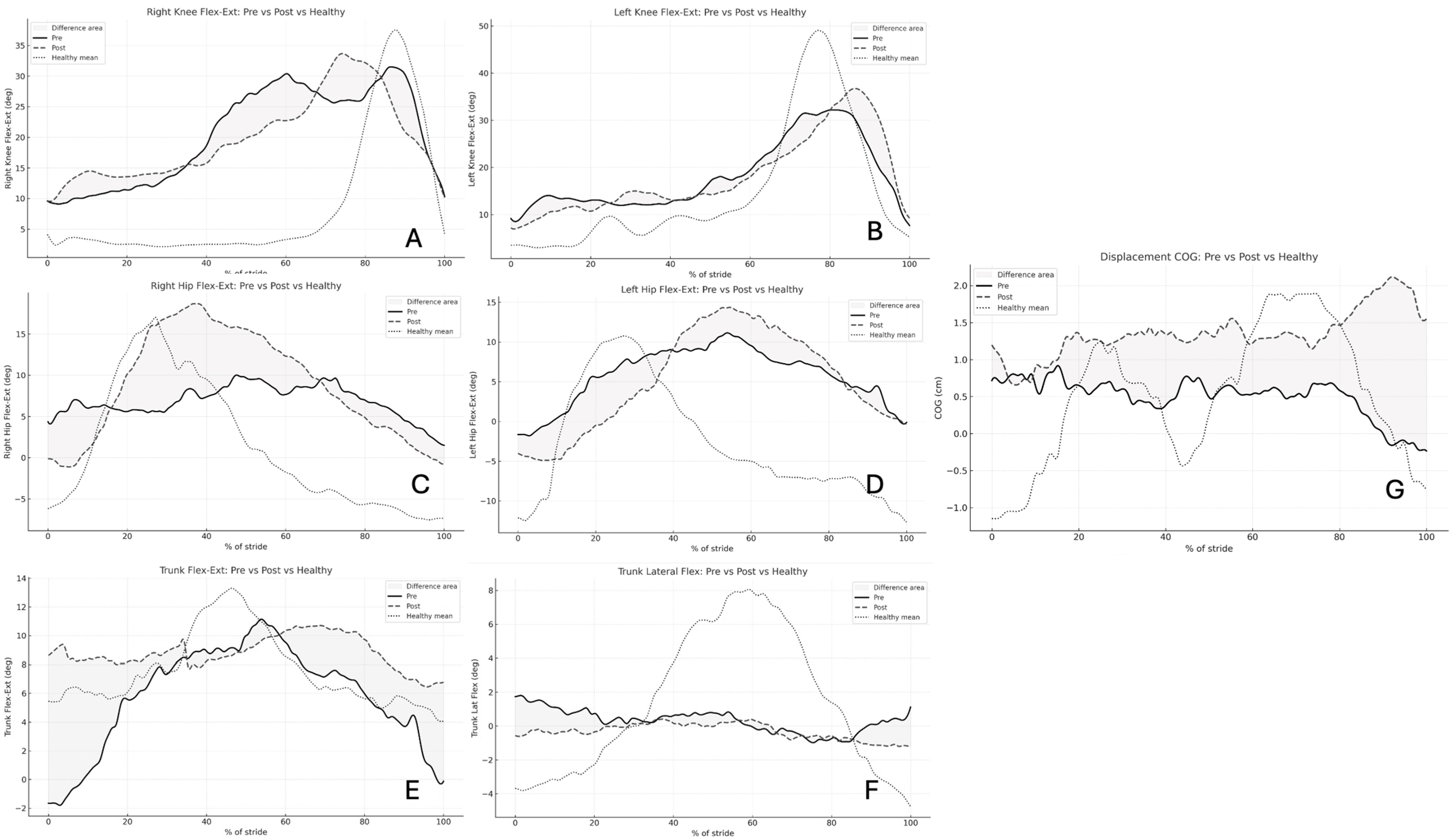 Figure 1. Kinematic trajectories before and after robotic gait rehabilitation in neurological patients, overlaid with healthy reference data. Solid lines represent pre-intervention waveforms, dashed lines denote post-intervention, and dotted lines represent the healthy mean. The shaded gray regions highlight the difference between pre- and post-intervention trajectories. Each plot corresponds to one key variable: (A) right knee flexion–extension, (B) left knee flexion–extension, (C) right hip flexion–extension, (D) left hip flexion–extension, (E) trunk flexion–extension, (F) trunk lateral flexion, and (G) center of gravity (COG) displacement.
