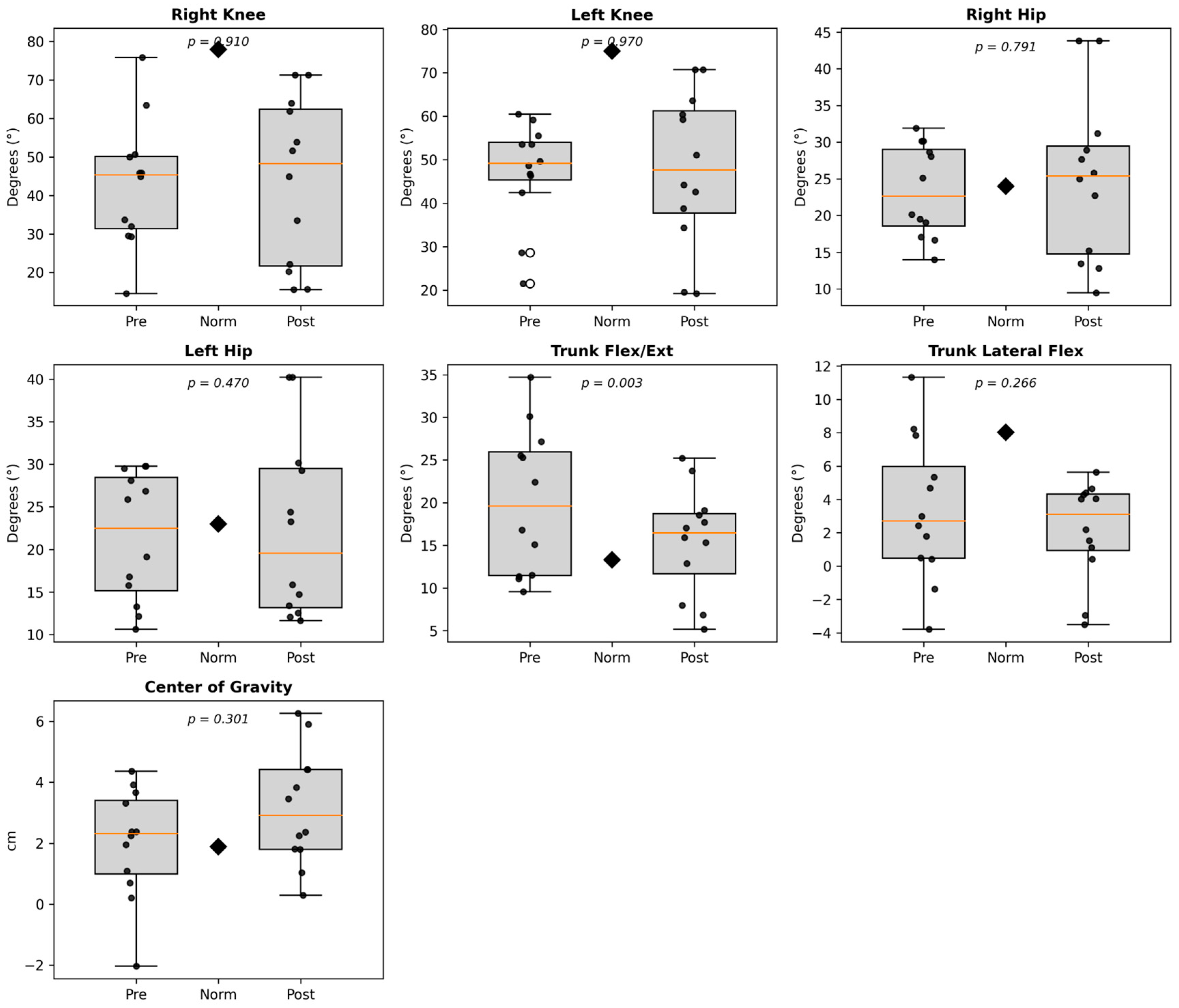 This study aimed to quantify pre- to post-intervention changes in lower-limb and trunk kinematics, as well as COG displacement, following 16 sessions of intensive robotic gait training using the Tecnobody Smart Gravity Walker. We hypothesized that robotic rehabilitation would enhance hip and trunk range of motion (ROM) and improve COG displacement, reflecting better dynamic trunk control and neuromechanical coupling between postural and locomotor systems.