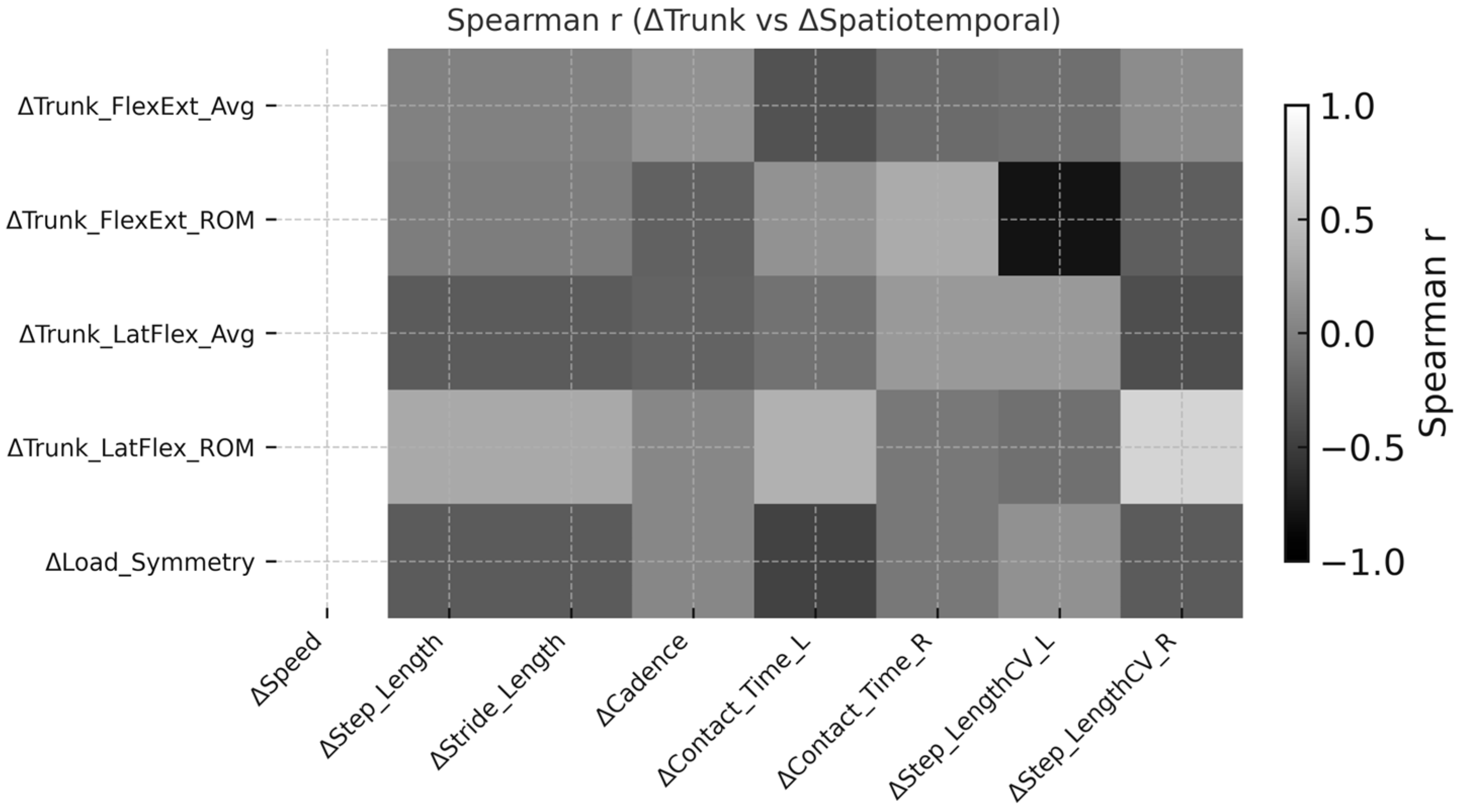 Figure 3. Spearman correlation heatmap (grayscale) illustrating the relationships between trunk stability and spatiotemporal gait adaptations after robotic rehabilitation. Each cell represents the Spearman correlation coefficient (r) between changes in trunk stability metrics and spatiotemporal parameters. Darker tones indicate stronger positive correlations, while lighter tones reflect weaker or negative associations.