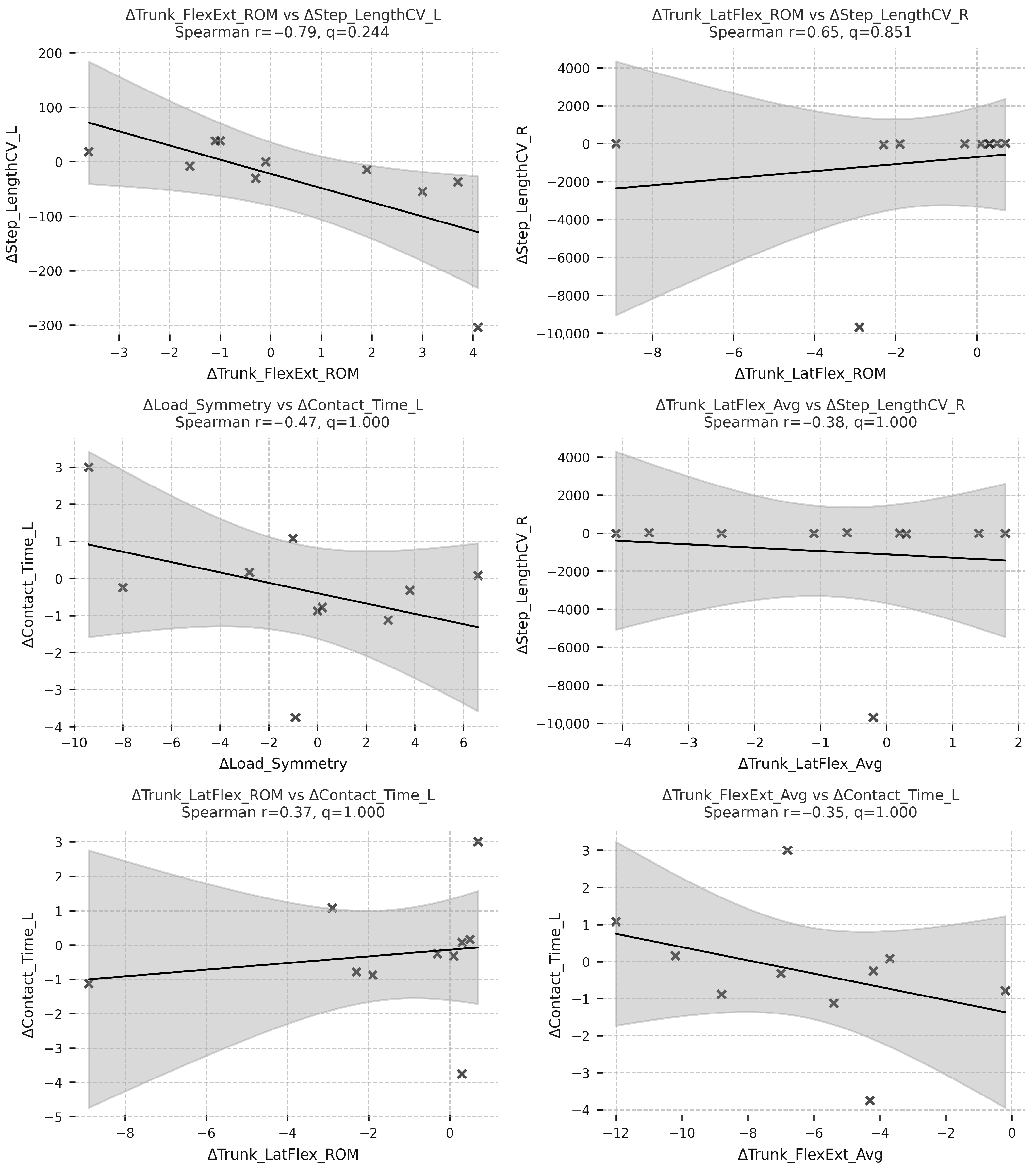 Figure 4. Strongest ΔTrunk–ΔSpatiotemporal Spearman r correlations (Spearman r). Each subplot shows the linear trend between changes in a trunk parameter and its corresponding spatiotemporal adaptation, including 95% confidence bands (gray shading).