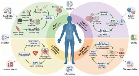 Functionally, we classify fusion of lifeform sensing systems into four classes according to their primary functional intent within the host organism. Class I (sensory and functional restoration) comprises neuroprosthetic systems that use electrical or optical encoding with individualized calibration to recover sensory and motor function. Class II (internal-state sensing) includes in vivo monitoring platforms for otherwise imperceptible physiological states (e.g., glucose, neurotransmitters, pressure, or flow) with optional therapeutic actuation. Class III (beyond-natural sensing) refers to augmentative systems that map non-human modalities (e.g., infrared/ultraviolet, magnetic, echoic, or radiation signals) onto neural substrates through direct encoding or sensory substitution combined with adaptive training. Class IV (cognition and learning enhancement) encompasses brain–data and brain–AI interfaces that extend cognitive capacity via external information delivery and targeted neuromodulation.