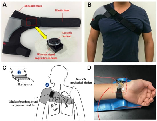 lFlexible wireless sensing system for asthma management. (A) Structural design of the flexible respiratory sound patch. (B) Schematic of on-body use, with the patch attached to the chest wall to capture breathing sounds. (C) System block diagram for real-time analysis of airway status. (D) Wrist-worn flexible blood-pressure sensor for coordinated monitoring. (A–C) Adapted from [132]; (D) adapted from [133].