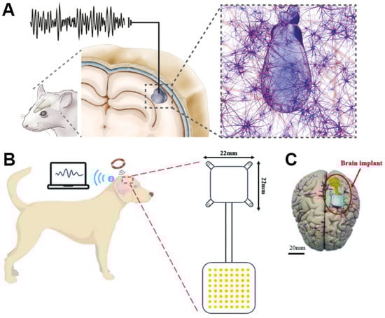 Implantable neural sensing interfaces for high-fidelity brain-state monitoring. (A) Schematic of a high-signal-to-noise-ratio conductive hydrogel suitable for acute and chronic inter-cortical and epidural neural recordings, illustrating its interaction with neurons in the mouse brain. (B) Schematic and enlarged view of a wireless miniature brain–computer interface system implanted in a Labrador retriever. (C) Conceptual illustration of the implantation site of the wireless miniature brain–computer interface system in the human brain. (A) Adapted from [141]; (B,C) adapted from [144].