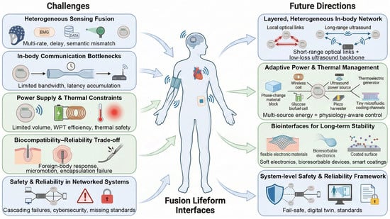 Conventional human–machine interaction models face persistent limitations: restricted information throughput and closed-loop latency [8,9]; micromotion and packaging that degrade signal quality [10,11]; power and thermal constraints that limit duty cycle [12,13]; validation protocols that focus on low-level signal metrics but do not adequately capture behaviorally relevant, real-world functional gains. These bottlenecks hinder scalability from single-organ assistance to hybrid organisms endowed with stable, high-bandwidth sensing and actuation. Therefore, a broader framework is needed—one that integrates sensing, actuation, energy management, packaging, and learning algorithms into cohesive symbiotic systems with standardized metrics, in order to ensure long-term performance and safety.
