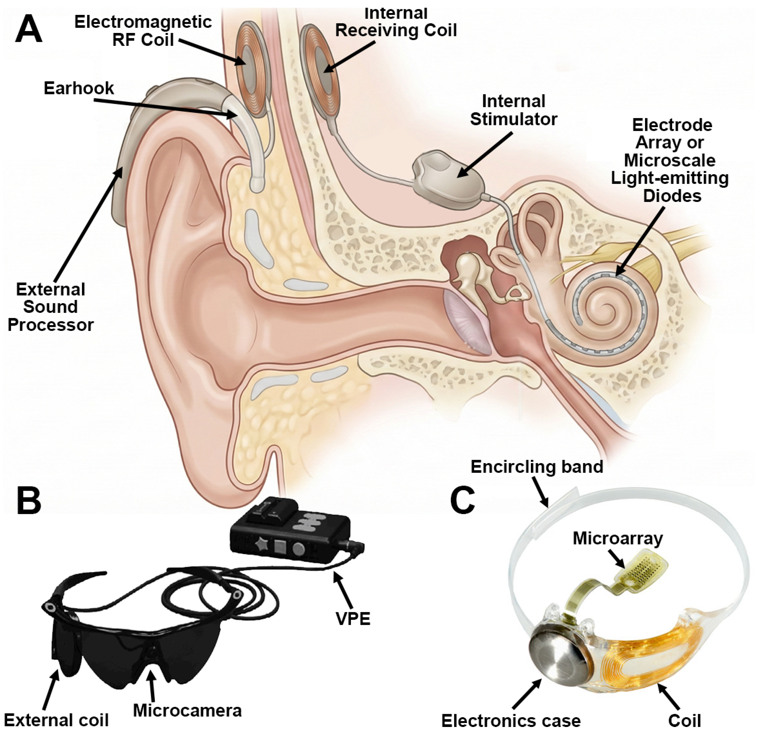 - Trevlakis, S.E.; Boulogeorgos, A.A.A.; Sofotasios, P.C.; Muhaidat, S.; Karagiannidis, G.K. Optical wireless cochlear implants. Biomed. Opt. Express 2019, 10, 707–730. [Google Scholar] [CrossRef]