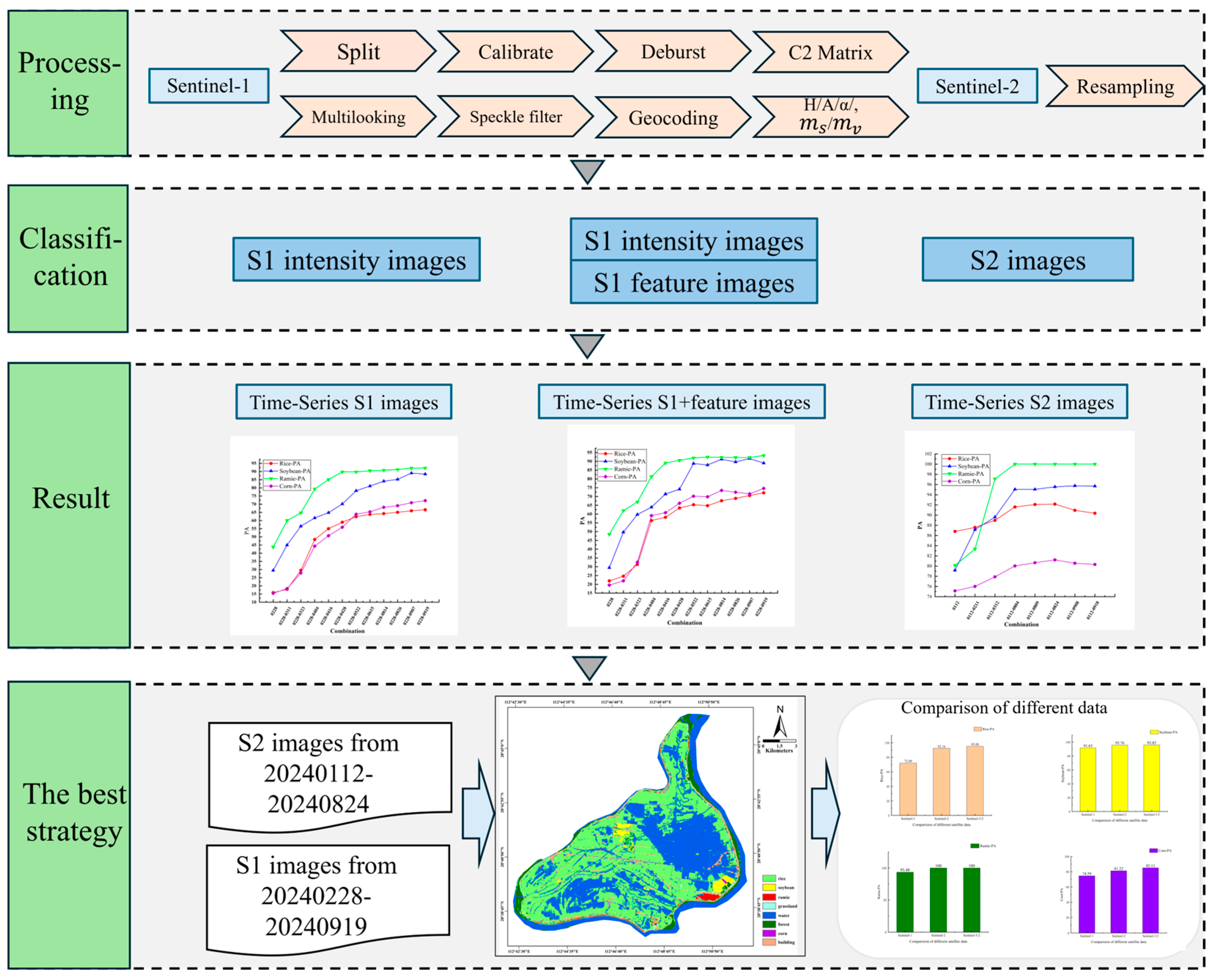 When only the 12 preprocessed intensity images from Sentinel-1 were used, the classification outcome proved inadequate. The OA of the classification results is 65.00%, the Kappa coefficient is 0.52. The PA values of the four crops including rice, soybean, corn, and ramie are 66.59%, 89.03%, 72.18%, 92.18%, respectively. Only utilizing the backscattering products of Sentinel-1 does not achieve good classification results. Consequently, in subsequent experiments, we leveraged dual-polarization decomposition to enhance the feature space of Sentinel-1 imagery and more comprehensively evaluated its efficacy in crop classification.
