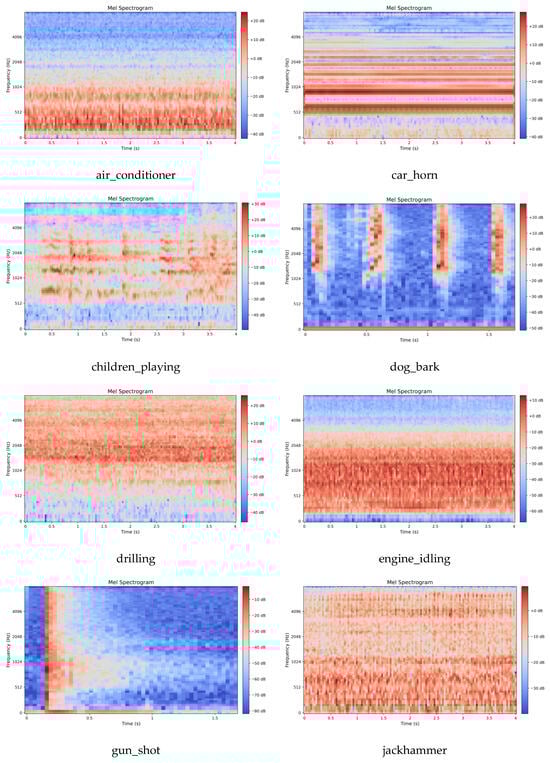 UrbanSound8K, as a benchmark dataset for environmental sound classification, contains 8732 audio samples, each of which is no longer than 4 s in duration, and consists of 10 types of urban environment audio events, including 10 types of urban environment sound events, namely air conditioner, car horn, children_playing, dog bark, drilling, engine idling, gunshot, jackhammer, siren, and street music. Sampling rates for the audio signals vary between 16 kHz and 48 kHz. We employed a random 8:2 split for training and testing to facilitate efficient comparison across multiple baseline models. To ensure the robustness of our proposed method, we additionally conducted 10-fold cross-validation following the official dataset partitions.