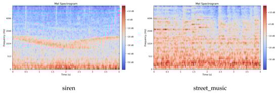 This work employs the Mel Spectrogram for acoustic feature extraction. Mel spectrograms are time-frequency representations that map acoustic signals onto the Mel scale, a perceptually motivated frequency scale designed to approximate human auditory sensitivity. The Mel scale applies a nonlinear transformation to linear frequency (Hz), emphasizing lower frequencies where human hearing exhibits finer resolution while compressing higher frequencies. This mapping is achieved through Mel filter bank applied to the power spectrum, yielding Mel-frequency coefficients that better align with perceptual loudness and pitch discrimination. The preprocessing parameters were configured as follows: a uniform sampling rate of 16 kHz for UrbanSound8K and 22.05 kHz for the elevator dataset; an STFT Hamming window length of 2048; a frame stride of 512; and an 80-dimensional Mel filter bank. Following feature extraction, the energy values were transformed to a decibel (dB) scale via a logarithmic operation, yielding the final Mel spectrogram representation of the audio signal. The visual characteristics of the extracted Mel spectrograms for both datasets are displayed in Figure 3 and Figure 4.