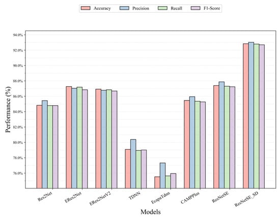 Table 5 presents comparative results between our proposed method and commonly used audio classification networks (ResNetSE, Res2Net, CAMPPlus, ERes2Net, ERes2NetV2, TDNN, EcapaTDNN) on the elevator audio dataset to demonstrate the effectiveness of our proposed method. It can be observed from the table that ResNetSE_SD significantly leads the other models with 90.78% accuracy. Compared with the baseline model ResNetSE, ResNetSE_SD shows an improvement of 2.21% in accuracy, with simultaneous improvements in Precision (+2.14%), Recall (+2.21%), and F1-score (+2.23%), which is significantly better than its baseline ResNetSE, demonstrating the effectiveness of the distillation loss and feature alignment loss. In the comparison models, the model shows a 1.25% and 1.71% accuracy advantage over suboptimal performers ERes2NetV2 (89.53%) and CAMPPlus (89.07%), respectively, reflecting its excellent performance in the overall classification task. CAMPPlus performs the best in terms of loss values with 89.07% accuracy. TDNN and EcapaTdnn are used to process sequence data, which are the classical networks for speech recognition applications. However, they do not achieve outstanding accuracy rates, with 85.44% and 86.78%, respectively. ResNetSE_SD has the highest precision rate of 90.70% among all models, indicating its excellent performance in reducing misclassification (false positives); the recall rate is as high as 90.76%, which indicates that the model can effectively identify samples in the target category, and the risk of misclassification (false-negative) risk is significantly reduced; the F1-score leads with a combined score of 90.72%, which further validates its balance between Precision and Recall, especially applicable to scenarios with unbalanced data distribution. A comparative view of the four key metrics for various models on the elevator dataset is provided in Figure 7, offering intuitive evidence for the superiority of our framework over existing approaches in terms of Accuracy, Precision, Recall, and F1.