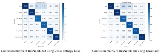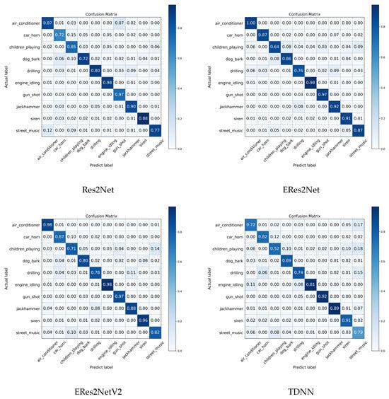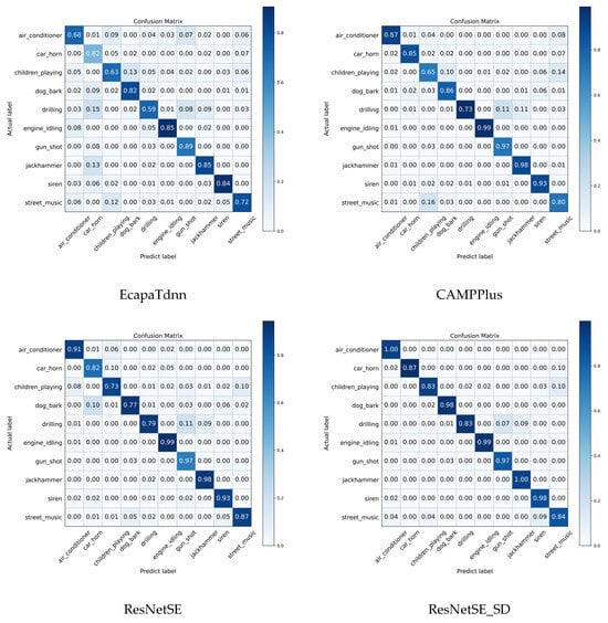 The confusion matrices for all models are presented in Figure 6. Notably, the ResNetSE_SD model achieves over 97% accuracy for categories such as air_conditioner, engine_idling, jack hammer, and gun_shot, demonstrating its proficiency in recognizing mechanical sounds. Compared to the baseline model ResNetSE, ResNetSE_SD significantly improves on most classes, with the dog_bark classification accuracy increasing from 77% to 98%, the accuracy of the children_playing classification improving from 73% to 83%, and the car_horn and siren categories showing a 5% improvement, respectively. Notably, misclassification is reduced, for example, the misclassification of the dog_bark class to car_horn is reduced from 10% to 0%, indicating that the feature alignment loss effectively suppresses sound confusion.