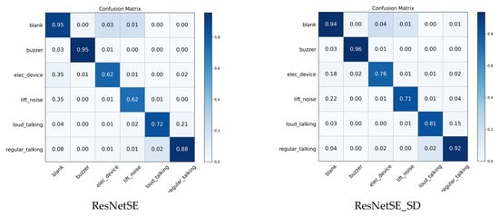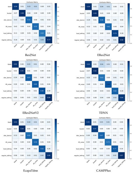 Figure 8 shows the confusion matrix for all evaluated models on the elevator audio dataset, revealing a clear performance difference between the majority and minority classes. For the high-frequency categories—such as blank, buzzer, and normal speech, which have percentage shares of 59.3%, 6.7%, and 16.3%, respectively—most models achieve approximately 90% recognition accuracy, demonstrating strong performance on categories with sufficient training samples. However, the key minority categories lift_noise and loud_talking, with percentage shares of only 2.1% and 4.8%, show a severe drop in accuracy: the baseline ResNetSE accuracy is only 62% and 72%, respectively, while the proposed ResNetSE_SD improves these metrics to 71% and 82%, significantly alleviating the challenge of category imbalance. The comparison model ERes2NetV2 also performs relatively well in a few categories, achieving accuracies of 69% and 80% in the classes lift_noise and loud_talking, respectively, but still not as well as ResNetSE_SD.
