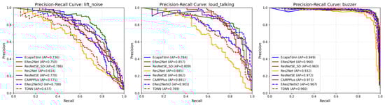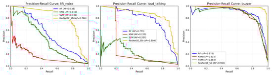 Figure 9 presents Precision-Recall curves for the three most challenging minority classes: lift_noise, loud_talking, and buzzer. ResNetSE-SD achieves the highest Average Precision (AP) for lift_noise and a competitive AP for loud_talking.