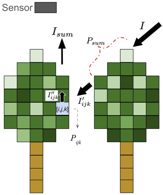The essential steps of VPDP [23] are summarized here. The attenuation of direct irradiance within the canopy was modeled using the Beer–Lambert law, where the cumulative number of LiDAR points along the light path was used as a proxy for LAD. Figure 3 provides an overview of the simulation concept. The shading of each voxel represents the number of LiDAR points contained within it.
