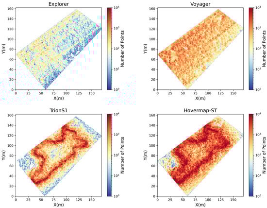 Spatial distribution of point cloud density (number of points per 0.5 m grid) for four LiDAR sensors: UAV-LiDARs (Explorer and Voyager) and HLSs (TrionS1 and Hovermap-ST). Warmer colors indicate higher point densities on a logarithmic scale. Each sensor exhibits distinct spatial coverage and density gradients reflecting differences in scanning geometry and platform motion.