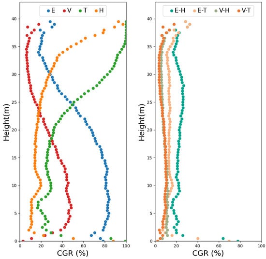 Vertical profiles of the coverage gap ratios (CGRs) for each LiDAR dataset compared with the all-merged voxel reference model. (Left) Single-sensor point clouds (E: Explorer; V: Voyager; T: TrionS1; H: Hovermap-ST) and (Right) Combined datasets (E-H: Explorer–HovermapST; E-T: Explorer–TrionS1; V-H: Voyager–HovermapST; V-T: Voyager–TrionS1). The X-axis represents the mean CGR within each 50 cm vertical layer and the Y-axis denotes height above ground level.