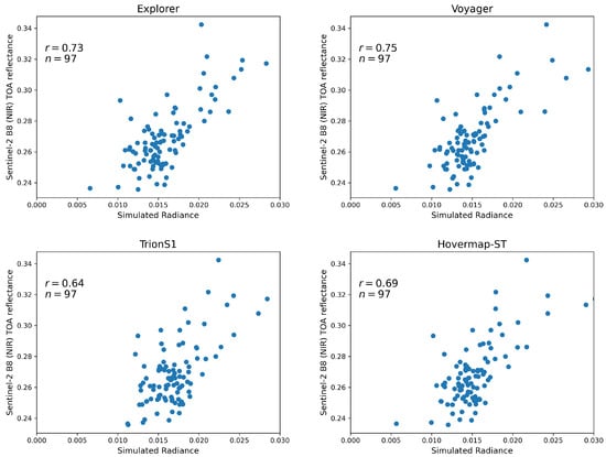 Correlation between simulated radiance derived from integrated LiDAR point clouds (UAV-LiDAR + HLS combinations) and Sentinel-2 NIR (Band 8) TOA reflectance.