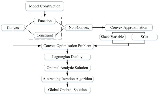 This paper formulates an optimization problem that contains both a non-convex objective function and non-convex constraints. The specific process is illustrated in Figure 2. First, to handle the non-convex components, a convex approximation approach is adopted: by introducing slack variables and employing the SCA technique, the original problem is transformed into a convex optimization problem. Subsequently, the Lagrangian dual method is applied to solve the convex problem, yielding an optimal analytical solution. Finally, an alternating iterative algorithm is used to iteratively optimize the variables, which ultimately converges to the global optimum.