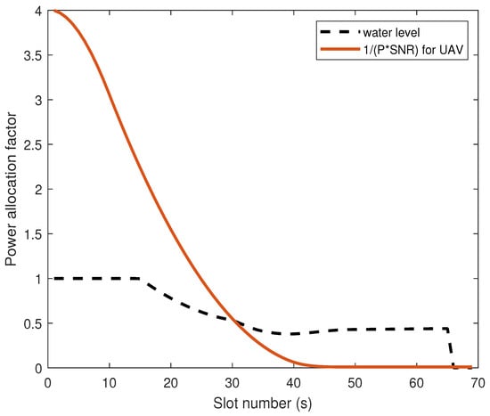 Figure 3 shows the WF situation of the optimal power of Alice’s transmitter as the UAV flight time (s) changes. As the UAV moves away from Alice, the Alice–UAV link is affected by the increase in link distance, and the signal-to-noise ratio of the link gradually decreases. When the 1/SNR is higher than the water level, the preset information transmission conditions are no longer met, and power is no longer injected.