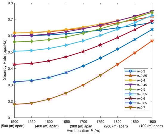 Figure 10 illustrates the impact of different power allocation factors on the system secrecy rate as the distance between Eve and Bob decreases (i.e., the value of E increases). Assuming the UAV hovers at and the total power is constant, Eve’s channel condition is superior to Bob’s initially. As Eve gradually moves closer to Bob, the interference effect of AN on Eve weakens. However, the increasing distance of the UAV–Eve link also leads to a degradation of Eve’s channel quality. In summary, the system’s secrecy rate is enhanced. As the power allocation factor decreases, the proportion of power allocated to AN increases. This actively amplifies interference to artificially widen the disparity between Bob’s channel and Eve’s channel, thereby compensating to some extent for the security performance loss caused by Eve’s proximity. However, as the proportion of AN power continues to increase, the marginal improvement in secrecy rate it can provide gradually diminishes. The secrecy capacity curves corresponding to different power allocation factors may intersect. This occurs because the suppression effect of a high-power AN on the Eve can no longer outweigh the enhancement in the upper limit of transmission rate brought by allocating more power to the information-bearing signal. Consequently, under a total power constraint, a trade-off between the power allocated to the information signal and that allocated to the AN is necessary. This balance aims to maximize the secrecy capacity while simultaneously improving the information transmission efficiency.