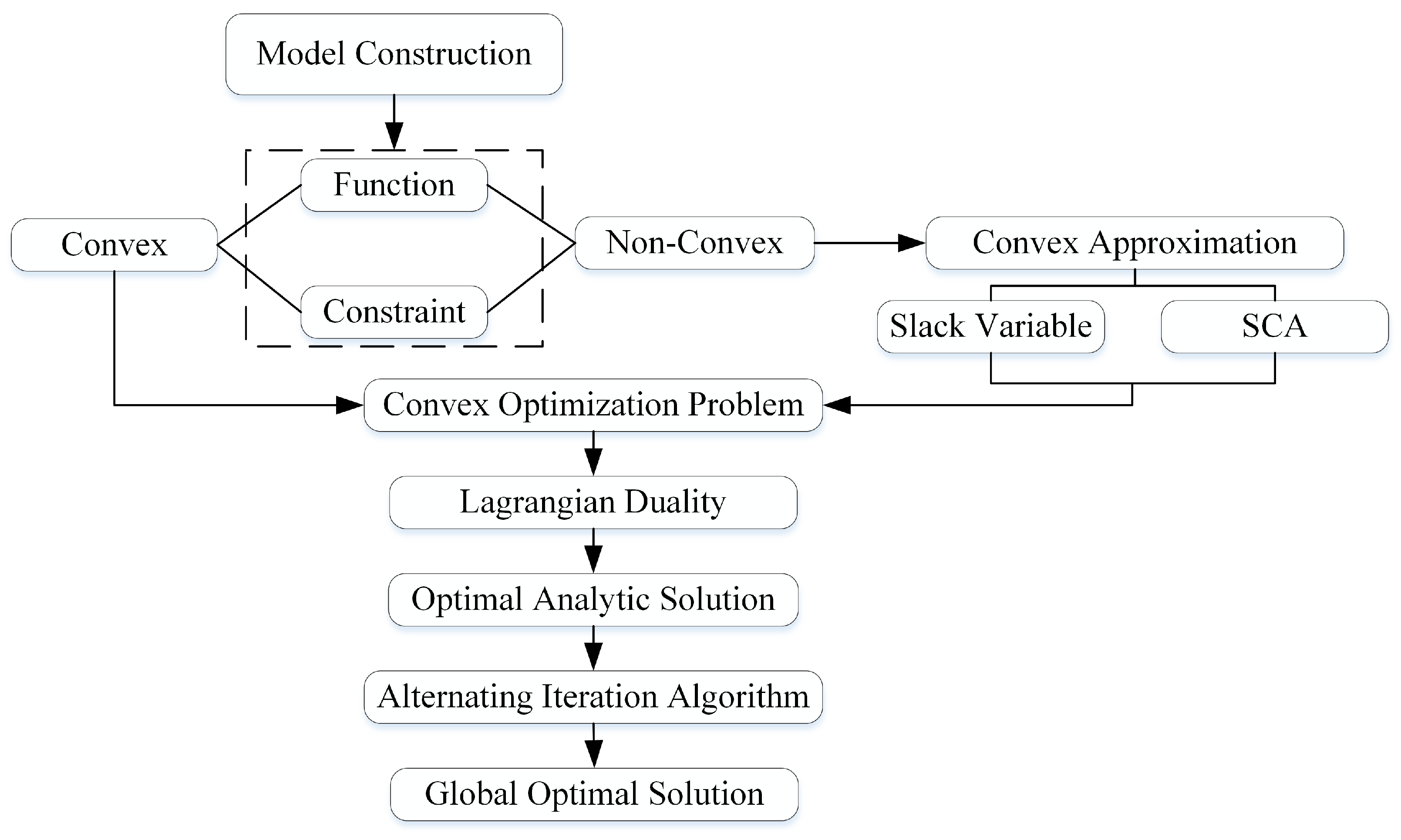 - The feasible domain shrinks, and by introducing relaxation variables, the solution space of the original problem is constrained to a more compact convex set.