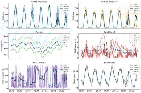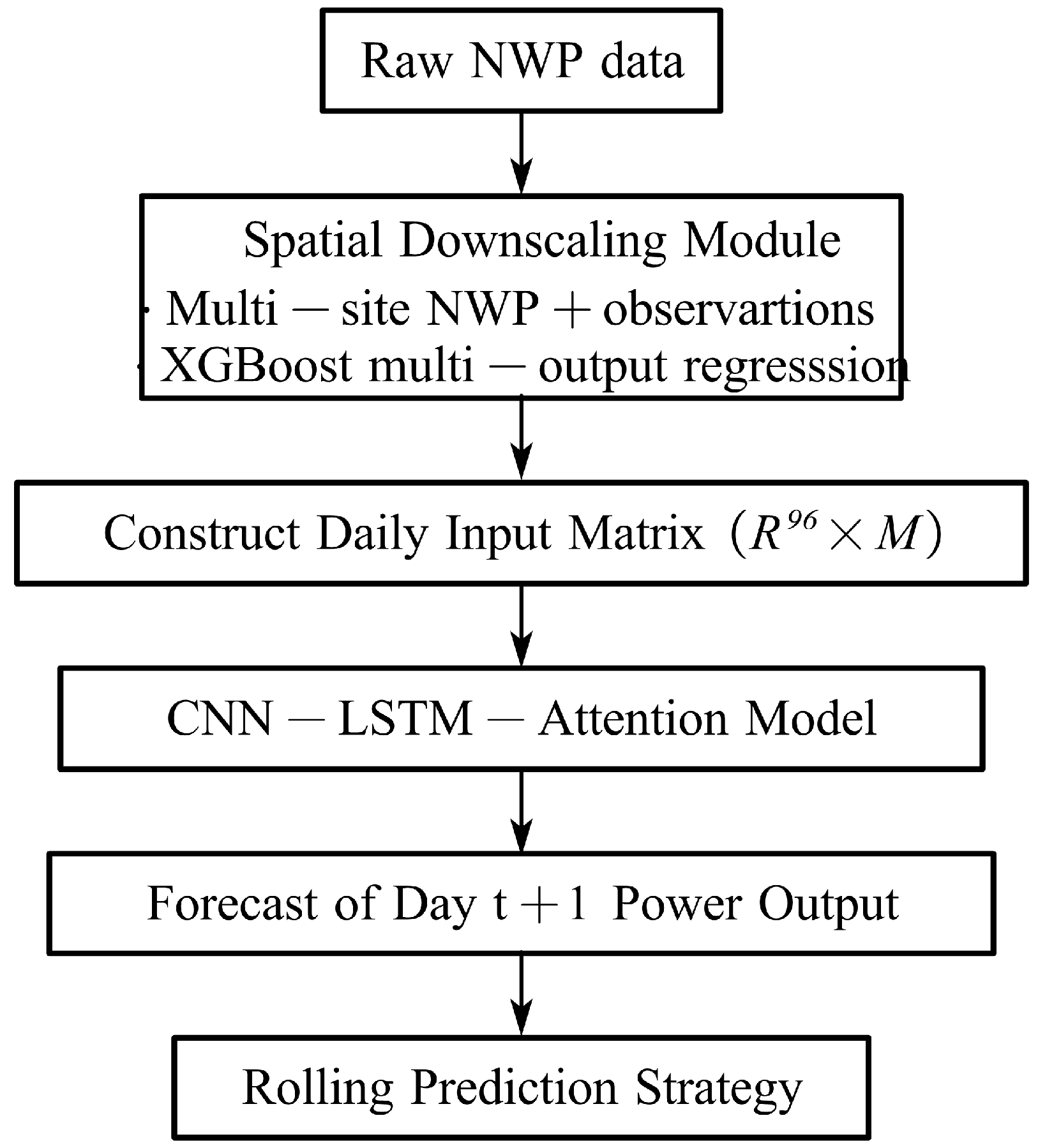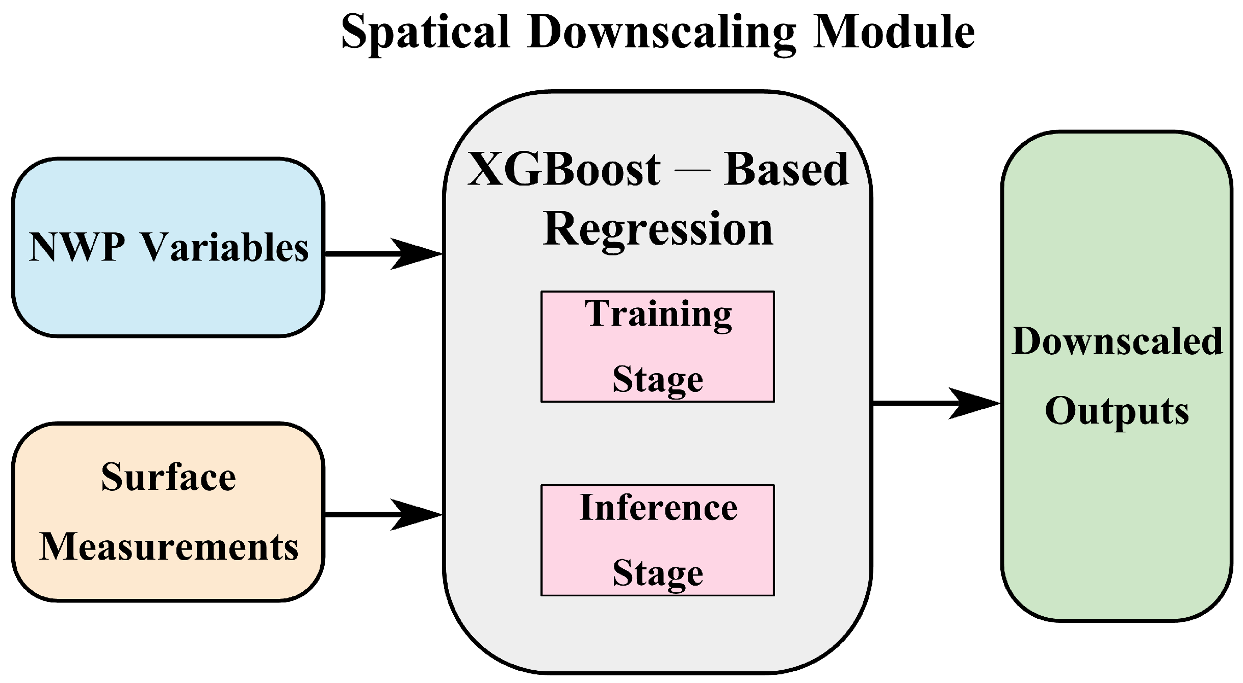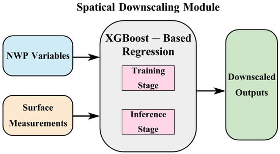 - A multi-site, multi-output spatial downscaling module is constructed using XGBoost to learn a nonlinear mapping from location/time encodings and heterogeneous NWP predictors to site-level meteorological vectors, trained only with measurement-based pairs from surrounding stations. This design enables plant-specific, high-resolution meteorological features to be generated from coarse NWP inputs, thereby reducing NWP-induced spatial bias at the target plant.