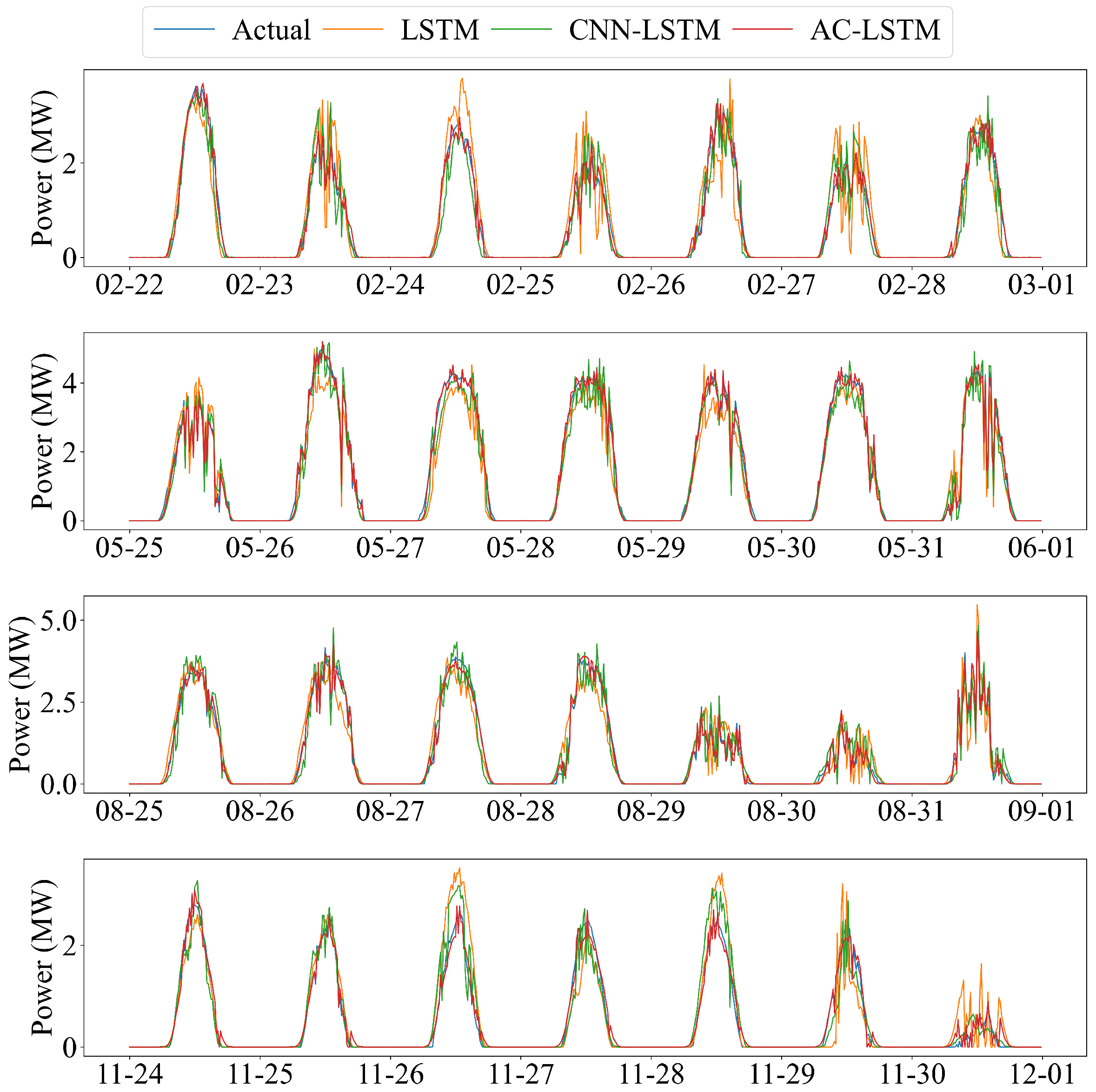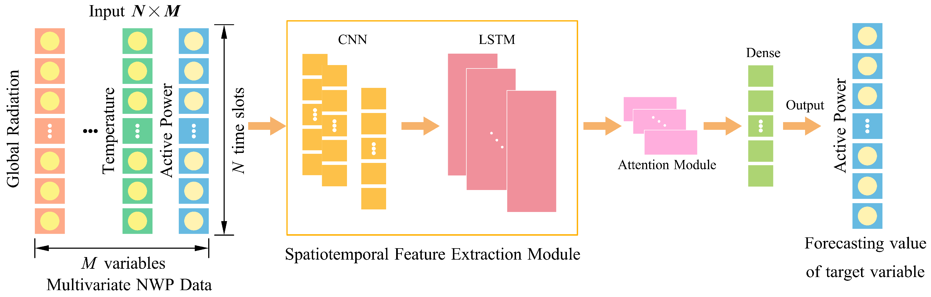 - An attention-enhanced CNN–LSTM forecasting model is developed to jointly capture short-term local patterns and long-term temporal dependencies, and to adaptively fuse multi-source meteorological predictors (irradiance, temperature, humidity, wind, etc.) with historical PV power. Comprehensive experiments on a multi-station PV dataset across representative months and across input/model configurations validate consistent accuracy improvements over baseline architectures in terms of RMSE, MAE, and correlation.