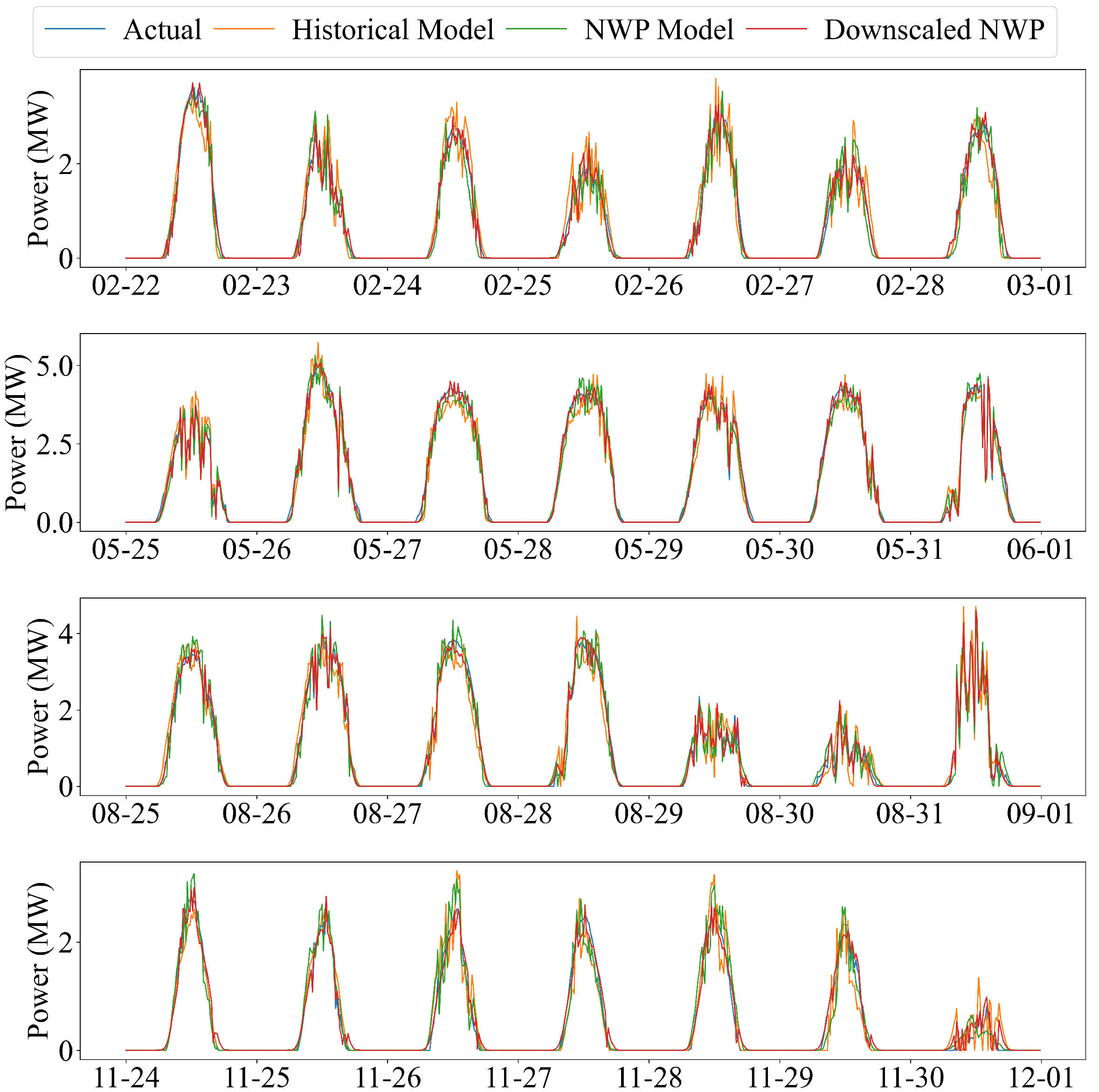 - Historical power + downscaled NWP: A forecasting model that uses high-resolution meteorological inputs generated by the spatial downscaling module.