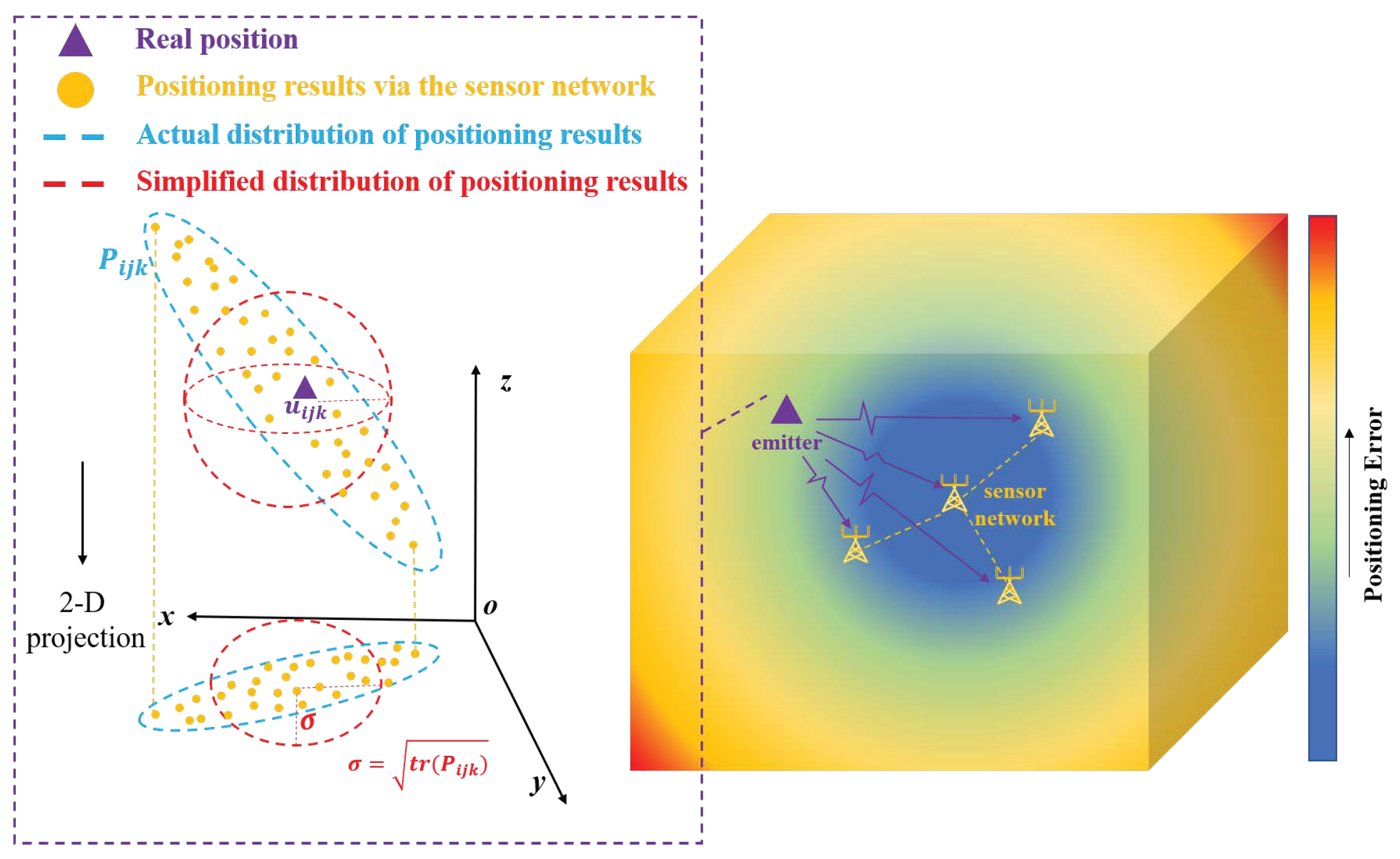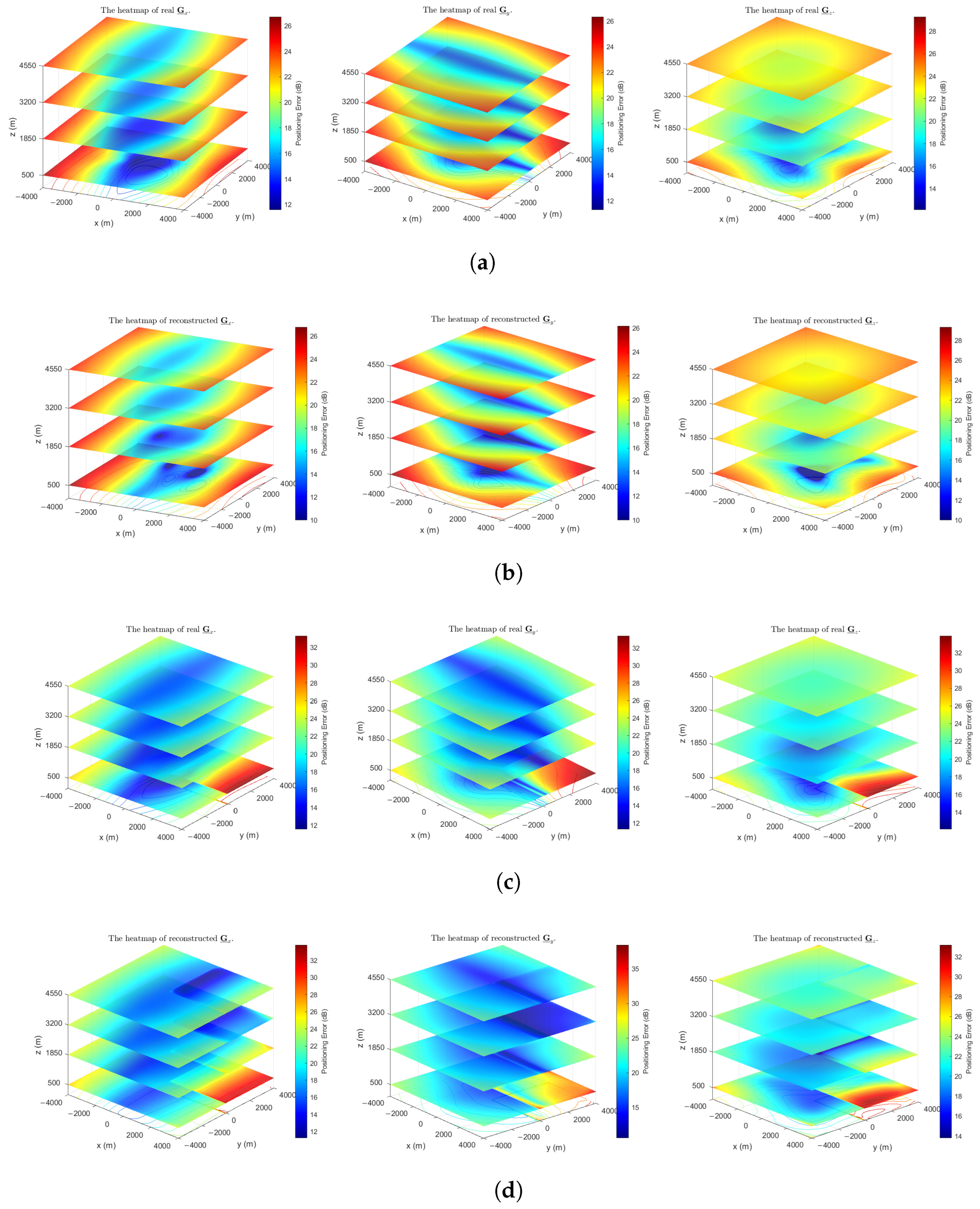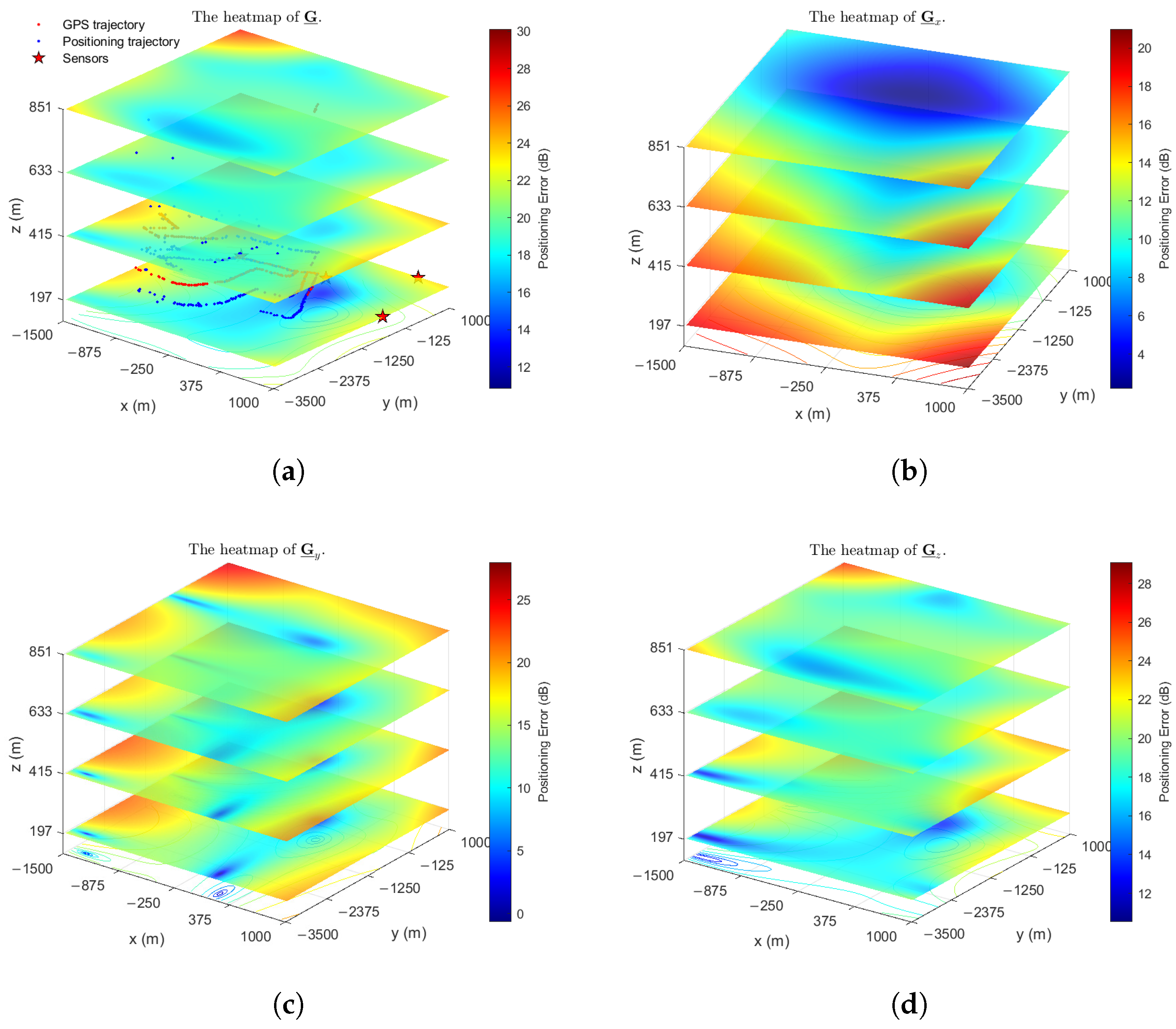- Tensor-Based Spatial Error Modeling (TGDOP): We propose a novel framework that models the spatial distribution of positioning errors as a third-order tensor. Unlike conventional scalar GDOP metrics, this tensor representation explicitly captures the anisotropic characteristics and complex coupling of error sources in real-world 3-D environments.