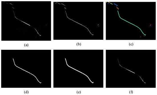 Light stripe segmentation process. (a) Original image; (b) Feature-enhanced result, where different colors represent different connected domains; (c) Connected components; (d) Stripe-connected component; (e) Stripe region mask; (f) Segmented stripe image.