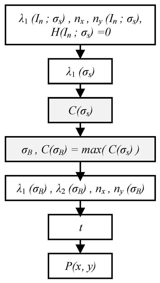 The procedure for light stripe center extraction is illustrated in Figure 7. First, the stripe features λ1, nx, ny, and H in the non-stripe region In are set to zero. Next, the Gaussian kernel σA best suited to the local stripe width is determined. Since smaller σ values yield larger eigenvalues λ1 within the stripe region, the eigenvalues λ1 must be normalized using Equation (7) during the adaptive multiscale feature selection [43]. The normalization operator C(σs) compensates for the attenuation of the gray gradient and eigenvalues caused by larger scales, ensuring comparability of eigenvalues across different scales.