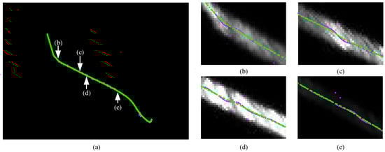 The center extraction results of the proposed method and the Steger method are compared as shown in Figure 9, marked in green and purple, respectively. Subfigures (b)–(e) provide magnified views of the center extraction results. When a small σ is used, two symmetric minima of the second derivative may form on both sides of the stripe coordinate, resulting in spurious center points in the output. Additionally, extracting the center from stripes with non-smooth gray-level variations introduces further errors. Conversely, a large σ tends to smooth corner regions of the stripe into arcs, causing the extracted centerline to lose genuine geometric detail, while excessive blurring in narrow stripe regions leads to deviations in the center coordinates. The proposed method overcomes these limitations by performing region-adaptive selection of the stripe width based on multiscale maximum normalized eigenvalues, thereby improving the accuracy of center extraction.