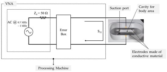 Experimental configuration for impedance measurement and data acquisition. The setup consists of a Vector Network Analyzer (VNA) interfaced with the load corresponding to the tissue region evaluated in this study. The configuration includes electrodes made of conductive material, a suction port, a cavity for body area placement, and a processing machine, as shown in the schematic representation. The same setup was used for all anatomical regions and experimental conditions.