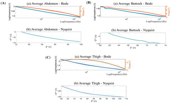 Bode and Nyquist diagrams. Upper section: Volumetric impedance plotted on a logarithmic scale (left axis) alongside phase angle (right axis) against frequency, also in logarithmic scale, ranging from 0.5 MHz to 1.5 MHz. Lower section: Negative imaginary component of impedance (−Z**) against real component of impedance (Z*). Panels show the following: (A) average data of abdomen of subject—Bode and average data of abdomen of subject—Nyquist; (B) average data of buttock of subject—Bode and average data of buttock of subject—Nyquist; and (C) Average data of thigh of subject—Bode and average data of thigh of subject—Nyquist.