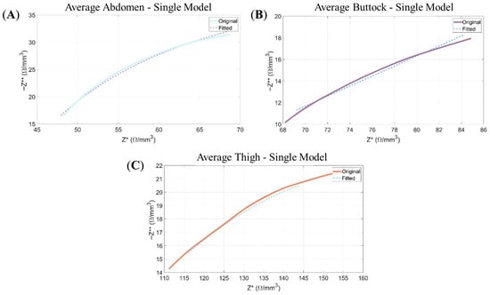Nyquist plots: Representation of the negative imaginary component of the impedance (−Z**) as a function of its real component (Z*). The continuous line corresponds to the experimental data, while the dashed line illustrates the modelled response obtained from the Single-Dispersion Equivalent Electrical Model. Panels show the following: (A) the average data of abdomen for the Single Model; (B) the average data of buttock for Single Model; and (C) the average data of thigh for Single Model.