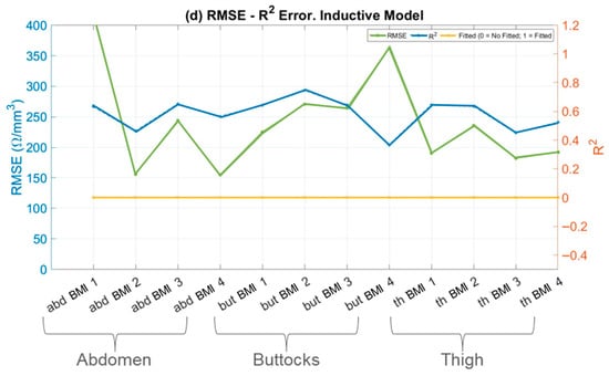 In contrast, the capacitive model, Figure 7c, and the inductive model, Figure 7d, show poor performance, with significantly higher RMSE values—approximately 100 times higher compared to the well-fitted models. The corresponding R2 values for these models are far from unity, indicating that they do not adequately capture the variability and complexity of the skin’s impedance data.