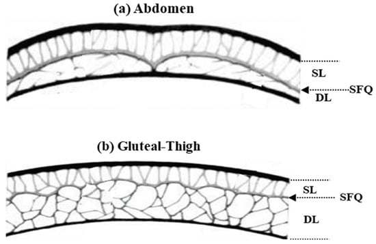 Study of the superficial and deep layers of fat in: (a) the abdomen; and (b) gluteal and thighs. The panel shows: SL, superficial layer; DL, deep layer; SQF, subcutaneous fat [29].