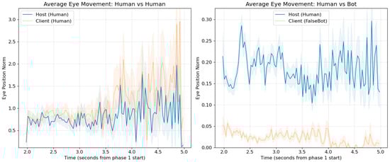 Figure 4 left shows the time-series averages of gaze trajectories for Human–Human pairs, while the right panel shows those for Human–Bot pairs. The Human–Human pairs exhibit stronger synchrony overall, although it is also evident that the human partner’s pupil dynamics are modulated when interacting with a Bot, producing patterns distinct from Human–Human interactions. It should be noted that these graphs represent averaged trajectories; actual DTW-based synchrony values vary across individual pairs.